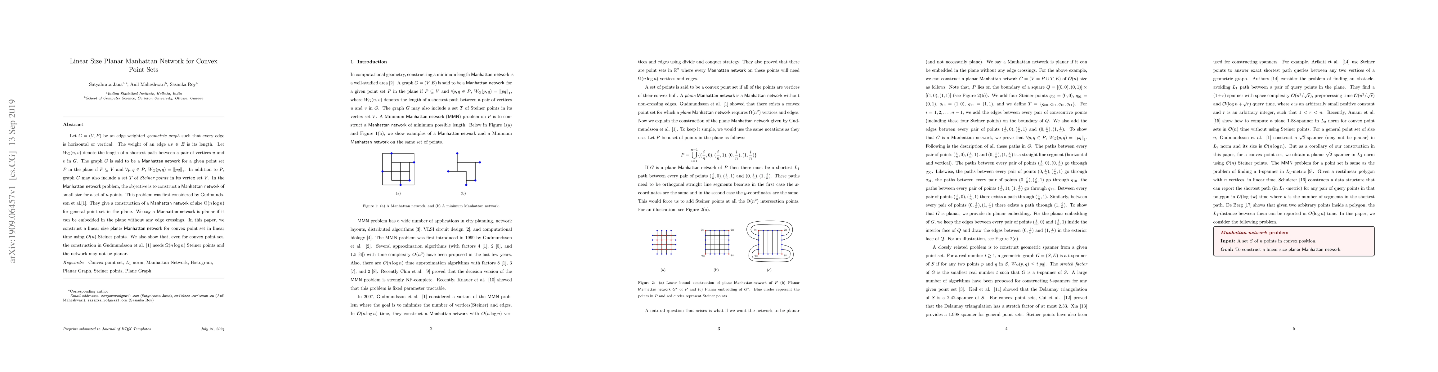 This paper constructs a linear size planar Manhattan network for convex point sets in linear time using $O(n)$ Steiner points, contrasting with Gudmundsson et al.'s $\Theta(n \log n)$ size and $\Omega(n \log n)$ Steiner points for general point sets, which may not be planar.