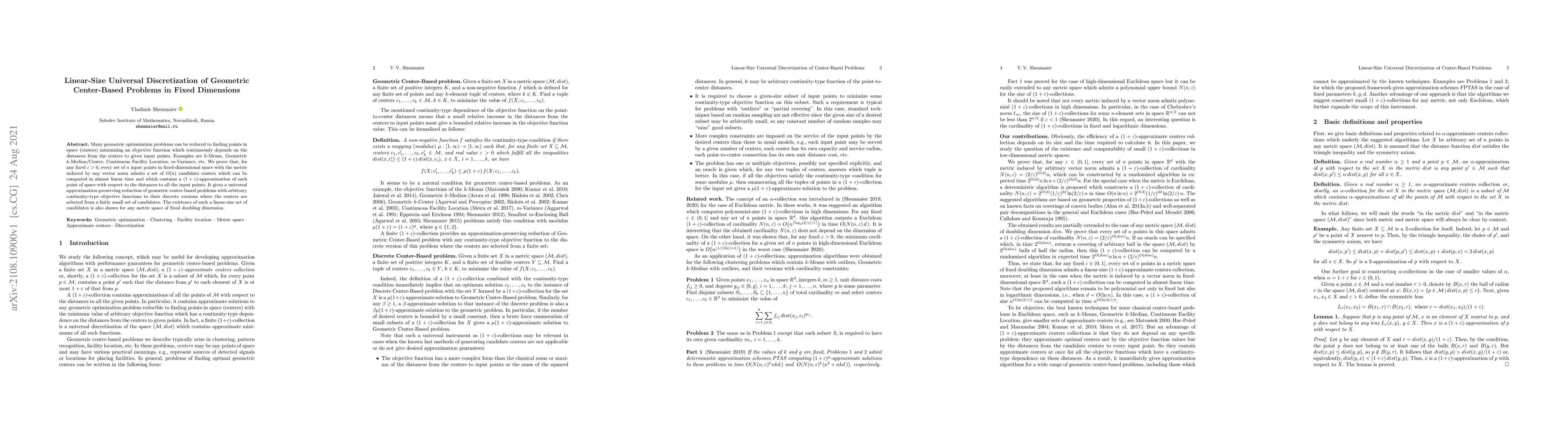 Many geometric optimization problems can be reduced to finding points in space (centers) minimizing an objective function which continuously depends on the distances from the centers to given input points. Examples are $k$-Means, Geometric $k$-Median/Center, Continuous Facility Location, $m$-Variance, etc. We prove that, for any fixed $\varepsilon>0$, every set of $n$ input points in fixed-dimensional space with the metric induced by any vector norm admits a set of $O(n)$ candidate centers which can be computed in almost linear time and which contains a $(1+\varepsilon)$-approximation of each point of space with respect to the distances to all the input points. It gives a universal approximation-preserving reduction of geometric center-based problems with arbitrary continuity-type objective functions to their discrete versions where the centers are selected from a fairly small set of candidates. The existence of such a linear-size set of candidates is also shown for any metric space of fixed doubling dimension.