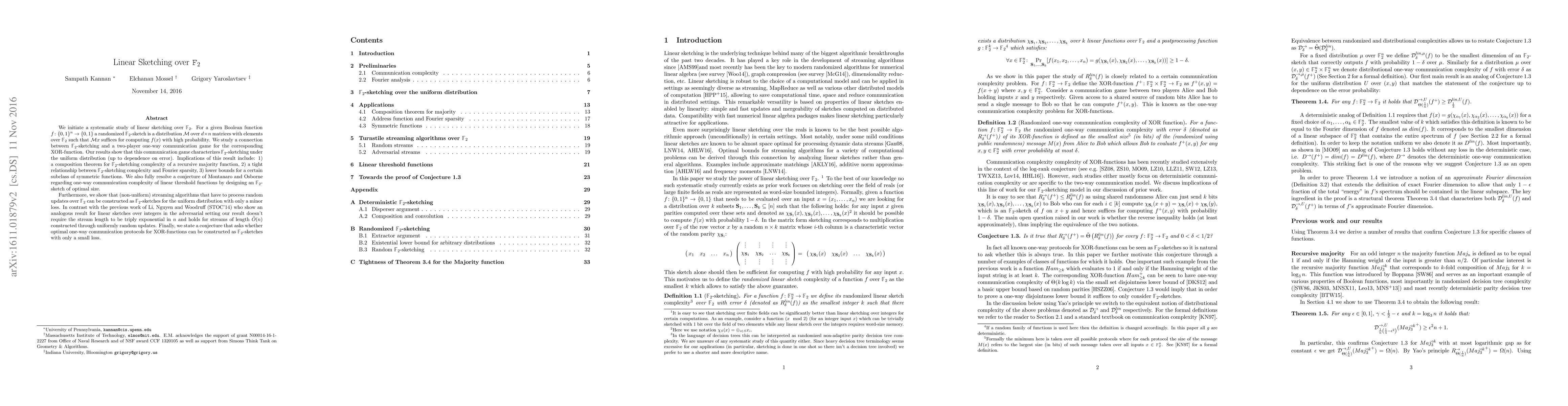 This paper initiates a systematic study of linear sketching over $\mathbb F_2$, establishing a connection between $\mathbb F_2$-sketching and a two-player communication game for XOR-functions, and proving implications including a composition theorem and tight relationships with Fourier sparsity. It also resolves a conjecture about optimal communication complexity for linear threshold functions and shows that streaming algorithms can be constructed as $\mathbb F_2$-sketches with minimal loss.