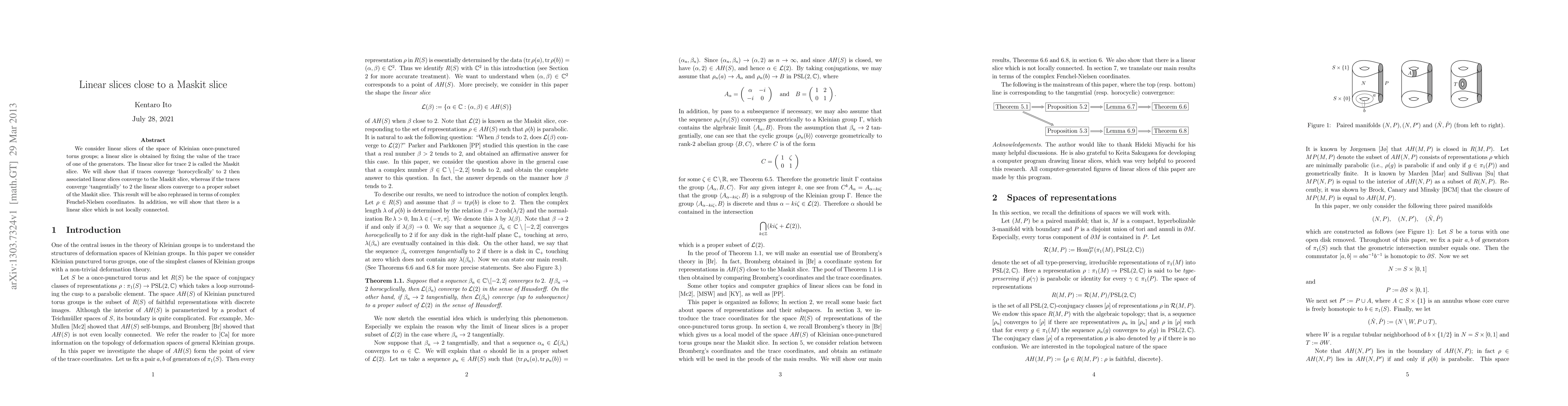 This paper investigates the convergence behavior of linear slices in the space of Kleinian once-punctured torus groups, showing that slices converging horocyclically to trace 2 converge to the Maskit slice, while tangential convergence leads to a proper subset. It also demonstrates the existence of a non-locally connected linear slice.