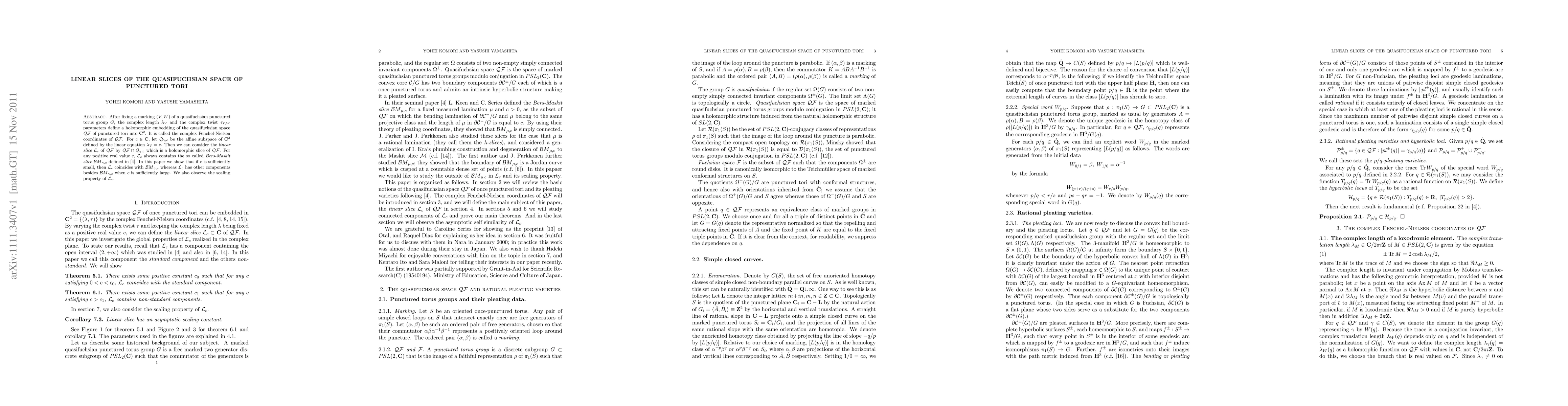 Researchers show that for small complex numbers c, a specific linear slice of the quasifuchsian space of punctured tori coincides with another slice called Bers-Maskit, but for larger c, it has additional components.