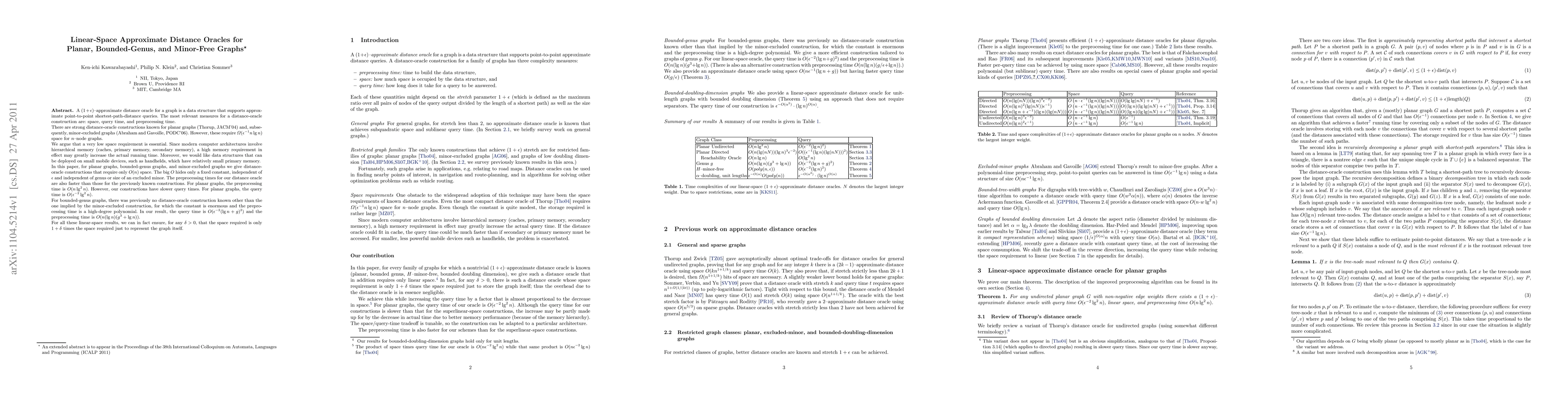 A (1 + eps)-approximate distance oracle for a graph is a data structure that supports approximate point-to-point shortest-path-distance queries. The most relevant measures for a distance-oracle construction are: space, query time, and preprocessing time. There are strong distance-oracle constructions known for planar graphs (Thorup, JACM'04) and, subsequently, minor-excluded graphs (Abraham and Gavoille, PODC'06). However, these require Omega(eps^{-1} n lg n) space for n-node graphs. We argue that a very low space requirement is essential. Since modern computer architectures involve hierarchical memory (caches, primary memory, secondary memory), a high memory requirement in effect may greatly increase the actual running time. Moreover, we would like data structures that can be deployed on small mobile devices, such as handhelds, which have relatively small primary memory. In this paper, for planar graphs, bounded-genus graphs, and minor-excluded graphs we give distance-oracle constructions that require only O(n) space. The big O hides only a fixed constant, independent of \epsilon and independent of genus or size of an excluded minor. The preprocessing times for our distance oracle are also faster than those for the previously known constructions. For planar graphs, the preprocessing time is O(n lg^2 n). However, our constructions have slower query times. For planar graphs, the query time is O(eps^{-2} lg^2 n). For our linear-space results, we can in fact ensure, for any delta > 0, that the space required is only 1 + delta times the space required just to represent the graph itself.