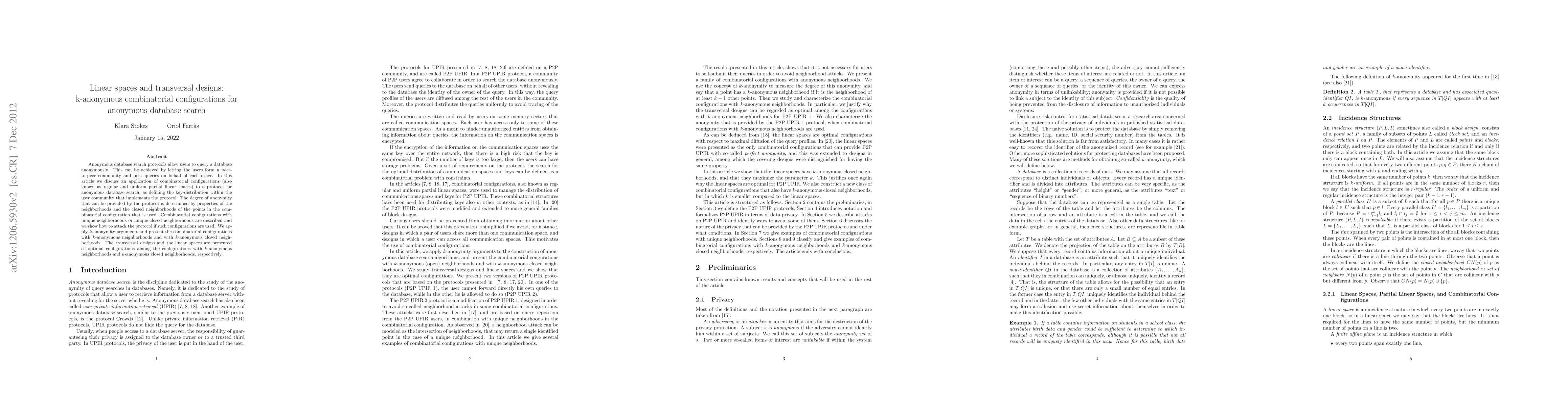 This paper explores the application of combinatorial configurations, specifically transversal designs and linear spaces, to enhance anonymity in peer-to-peer anonymous database search protocols. It demonstrates how k-anonymous neighborhoods and closed neighborhoods can be achieved using these configurations to ensure user privacy.
