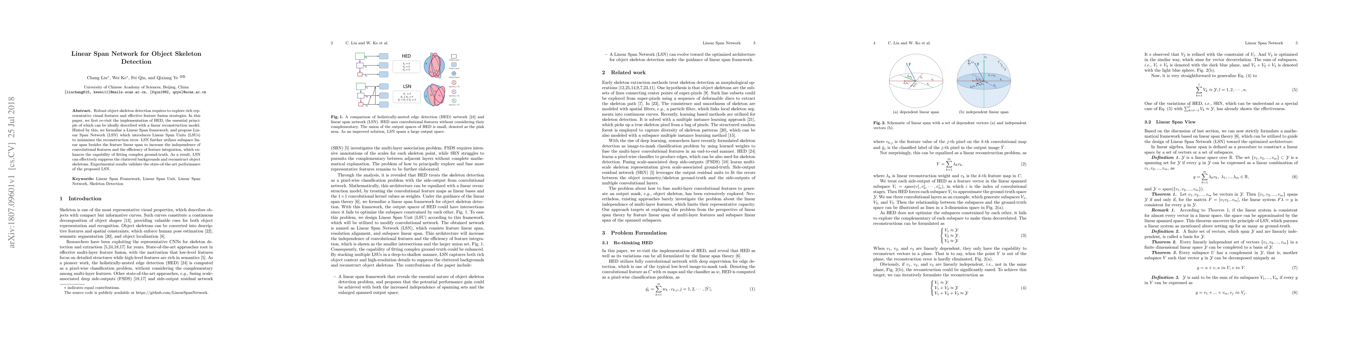 Robust object skeleton detection requires to explore rich representative visual features and effective feature fusion strategies. In this paper, we first re-visit the implementation of HED, the essential principle of which can be ideally described with a linear reconstruction model. Hinted by this, we formalize a Linear Span framework, and propose Linear Span Network (LSN) modified by Linear Span Units (LSUs), which minimize the reconstruction error of convolutional network. LSN further utilizes subspace linear span beside the feature linear span to increase the independence of convolutional features and the efficiency of feature integration, which enlarges the capability of fitting complex ground-truth. As a result, LSN can effectively suppress the cluttered backgrounds and reconstruct object skeletons. Experimental results validate the state-of-the-art performance of the proposed LSN.