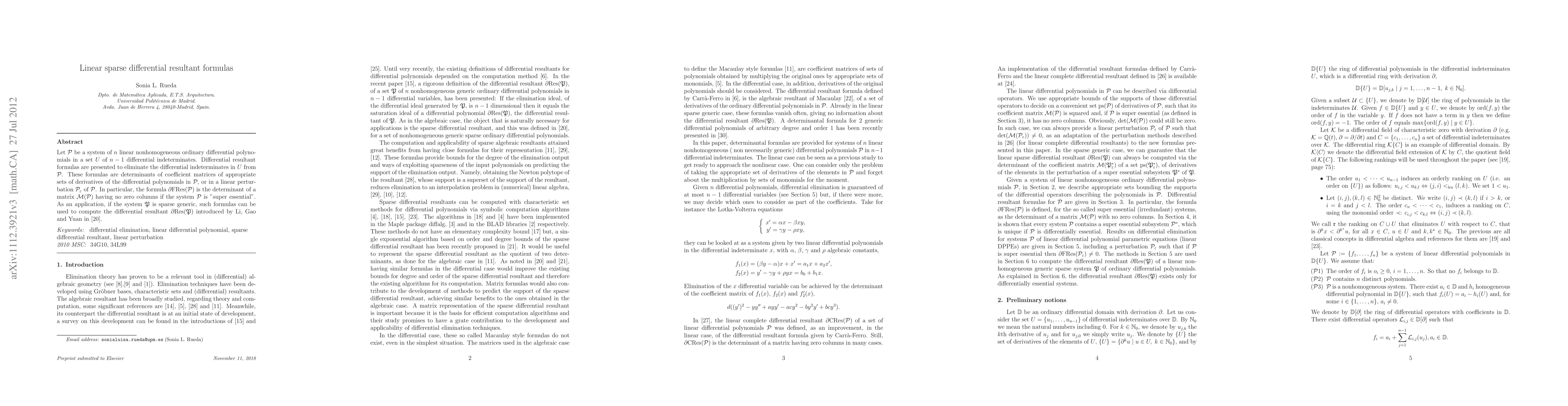 This paper presents differential resultant formulas to eliminate differential indeterminates from a system of linear nonhomogeneous ordinary differential polynomials. The formulas are determinants of coefficient matrices derived from appropriate sets of derivatives, and they can be applied to compute the differential resultant for sparse generic systems.