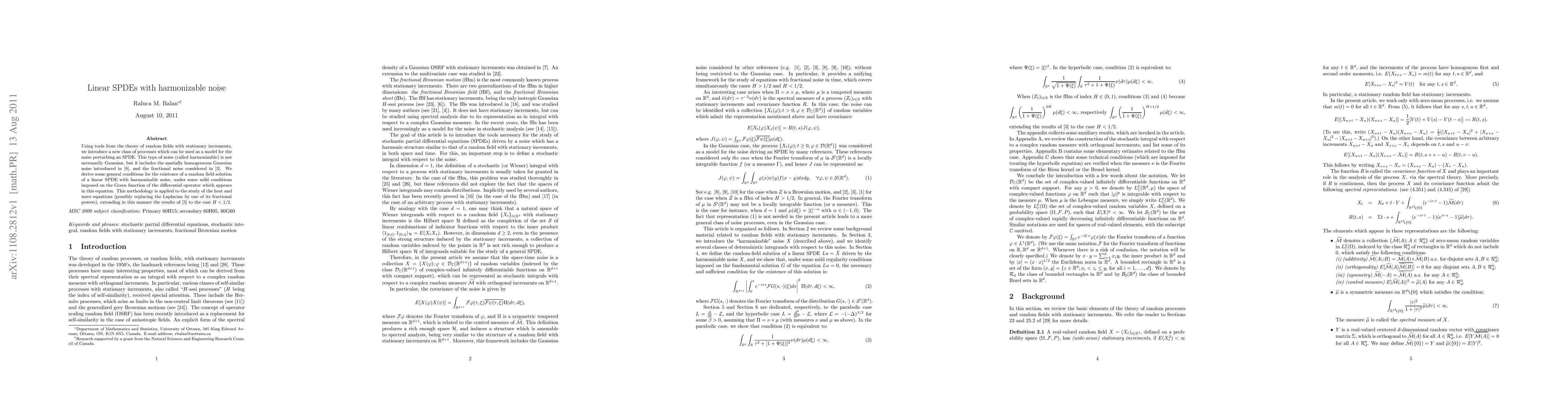 This research introduces a new class of non-Gaussian, 'harmonizable' noise models for linear Stochastic Partial Differential Equations (SPDEs), encompassing both Gaussian and fractional noises. It derives conditions for existence of solutions under mild Green function constraints, extending previous results to H<1/2, and applies these to heat and wave equations.