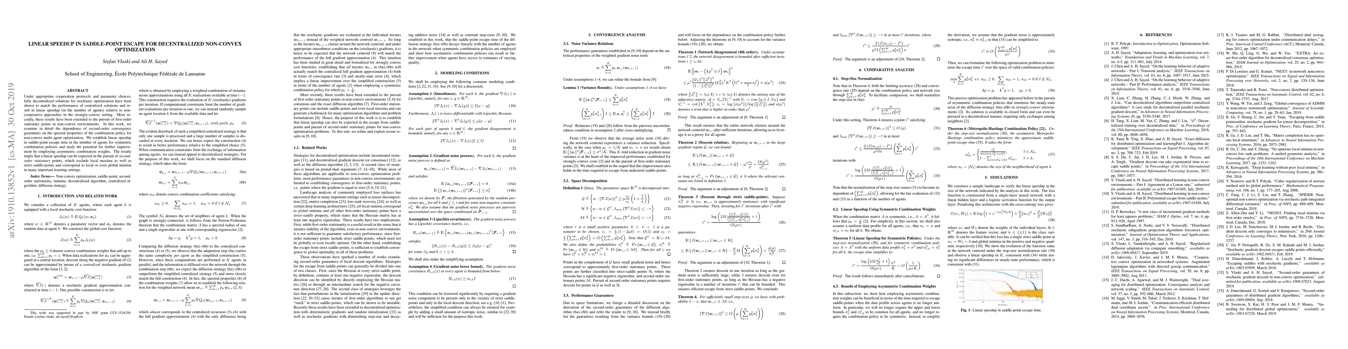 Under appropriate cooperation protocols and parameter choices, fully decentralized solutions for stochastic optimization have been shown to match the performance of centralized solutions and result in linear speedup (in the number of agents) relative to non-cooperative approaches in the strongly-convex setting. More recently, these results have been extended to the pursuit of first-order stationary points in non-convex environments. In this work, we examine in detail the dependence of second-order convergence guarantees on the spectral properties of the combination policy for non-convex multi agent optimization. We establish linear speedup in saddle-point escape time in the number of agents for symmetric combination policies and study the potential for further improvement by employing asymmetric combination weights. The results imply that a linear speedup can be expected in the pursuit of second-order stationary points, which exclude local maxima as well as strict saddle-points and correspond to local or even global minima in many important learning settings.