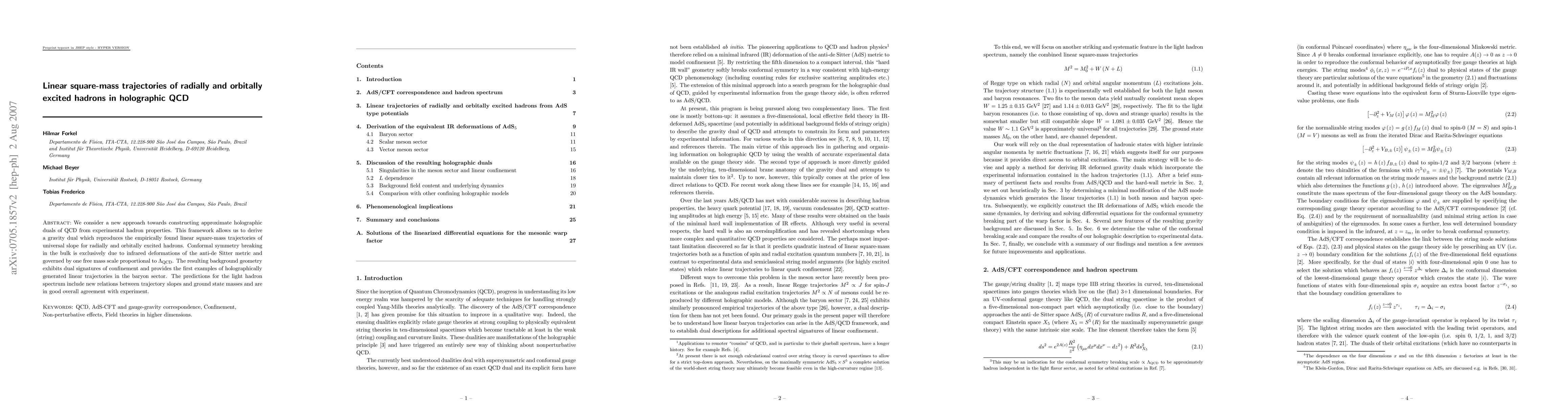 This paper proposes a novel holographic QCD model that reproduces linear square-mass trajectories for radially and orbitally excited hadrons, with conformal symmetry breaking driven by infrared deformations of the anti-de Sitter metric. The model's predictions align well with experimental data, including new relations between trajectory slopes and ground state masses.