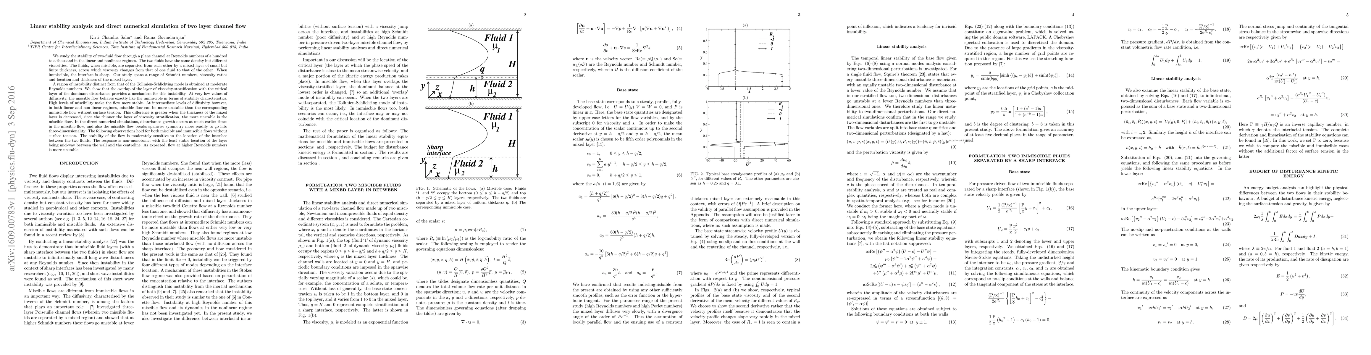 We study the stability of two-fluid flow through a plane channel at Reynolds numbers of a hundred to a thousand in the linear and nonlinear regimes. The two fluids have the same density but different viscosities. The fluids, when miscible, are separated from each other by a mixed layer of small but finite thickness, across which viscosity changes from that of one fluid to that of the other. When immiscible, the interface is sharp. Our study spans a range of Schmidt numbers, viscosity ratios and location and thickness of the mixed layer. A region of instability distinct from that of the Tollmien-Schlichting mode is obtained at moderate Reynolds numbers. We show that the overlap of the layer of viscosity-stratification with the critical layer of the dominant disturbance provides a mechanism for this instability. At very low values of diffusivity, the miscible flow behaves exactly like the immiscible in terms of stability characteristics. High levels of miscibility make the flow more stable. At intermediate levels of diffusivity however, in both linear and non-linear regimes, miscible flow can be more unstable than the corresponding immiscible flow without surface tension.