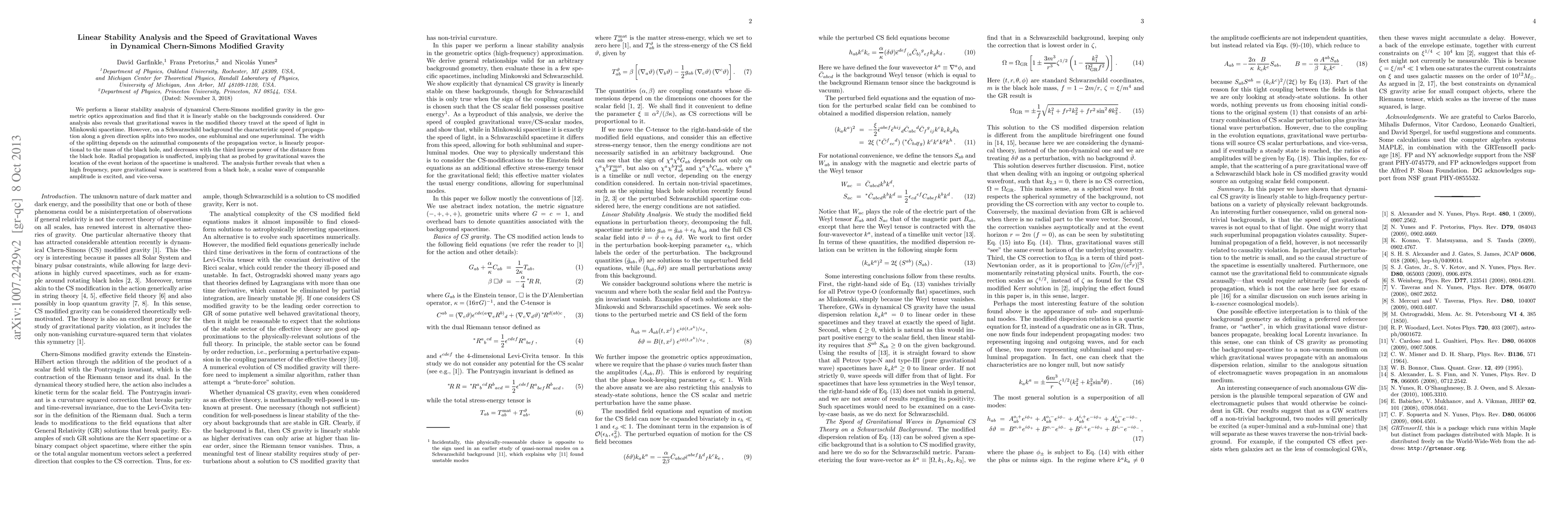 This paper conducts a linear stability analysis of dynamical Chern-Simons modified gravity, confirming its stability and finding that gravitational waves travel at the speed of light in Minkowski spacetime. In the presence of a Schwarzschild black hole, gravitational wave propagation splits into subluminal and superluminal modes, with the splitting width dependent on the black hole's mass and inversely proportional to the distance from it.