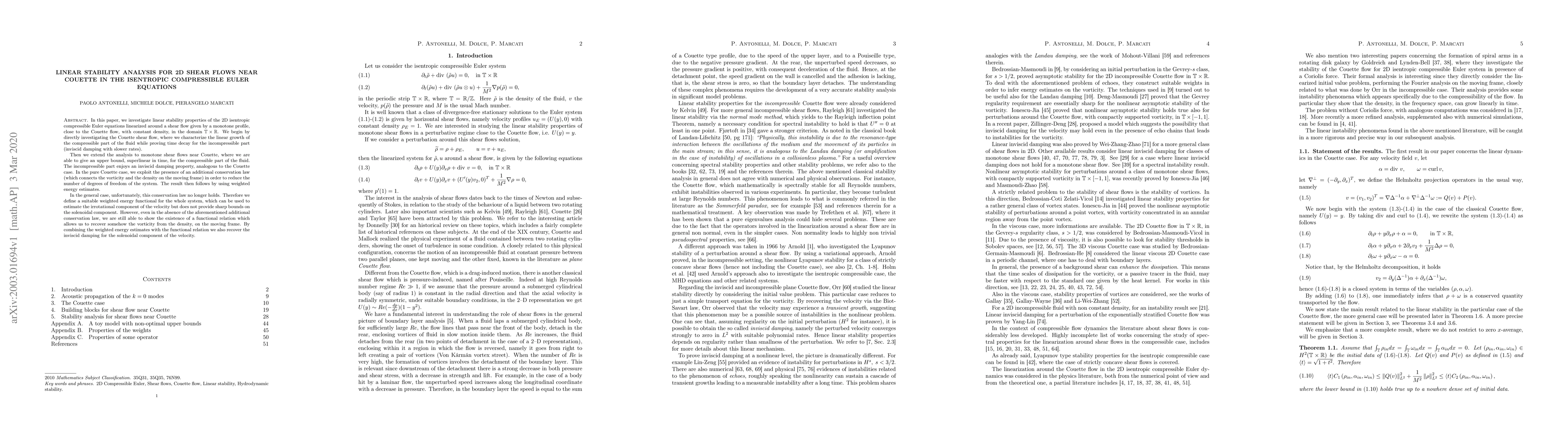 This paper conducts linear stability analysis for 2D shear flows near Couette in the isentropic compressible Euler equations, proving time decay for the incompressible part and superlinear growth for the compressible part. In the pure Couette case, an additional conservation law simplifies the analysis, while a weighted energy functional is used for general monotone shear flows.