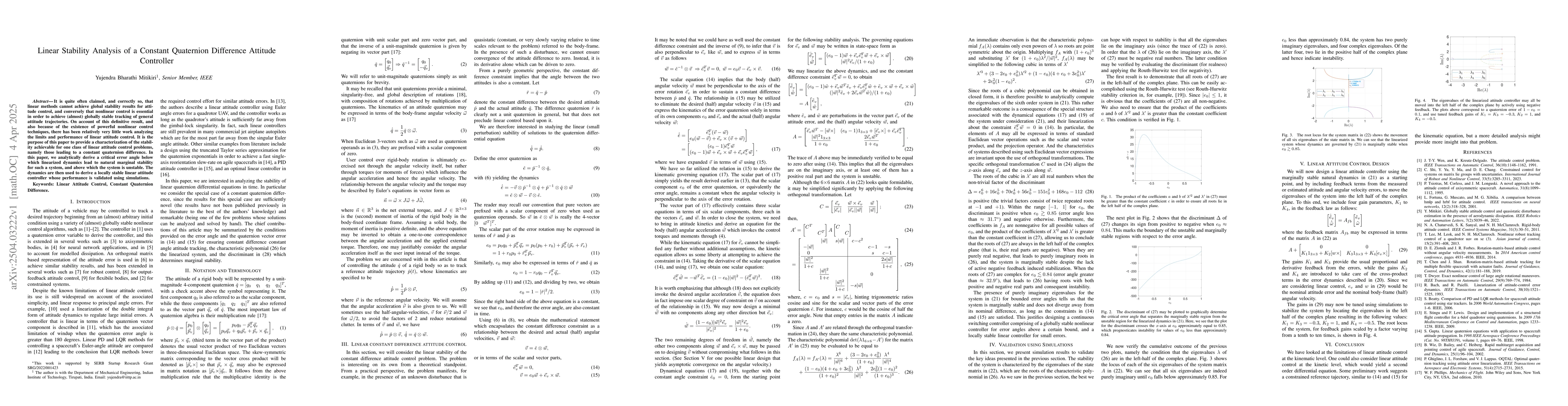 The paper analytically derives stability conditions for linear attitude control leading to constant quaternion difference, using linearized dynamics to design a locally stable controller.