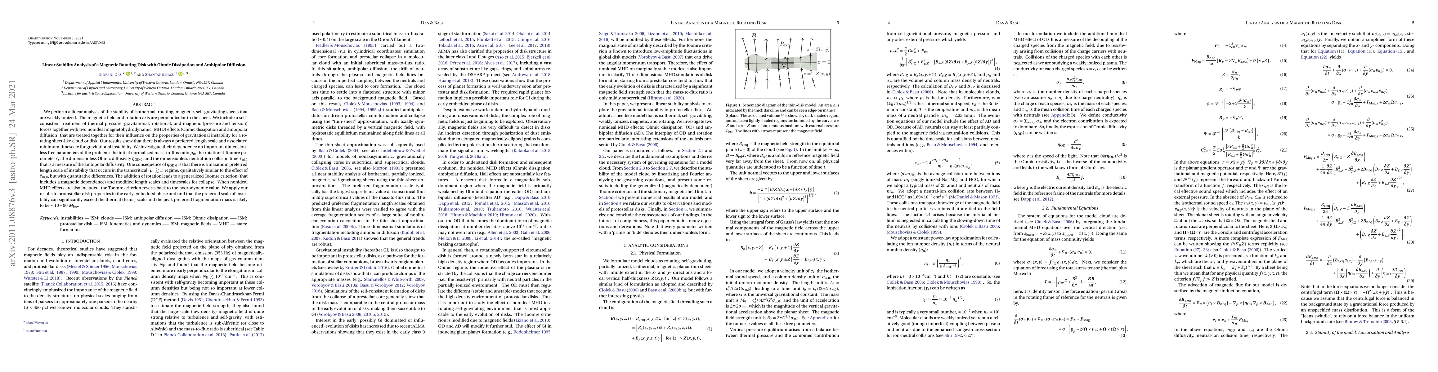 This paper conducts a linear stability analysis of rotating, magnetic, self-gravitating disks with weak ionization, focusing on the effects of Ohmic dissipation and ambipolar diffusion. It reveals a preferred length scale and associated minimum timescale for gravitational instability, influenced by parameters like the mass-to-flux ratio and rotational effects, with implications for protostellar disk fragmentation.