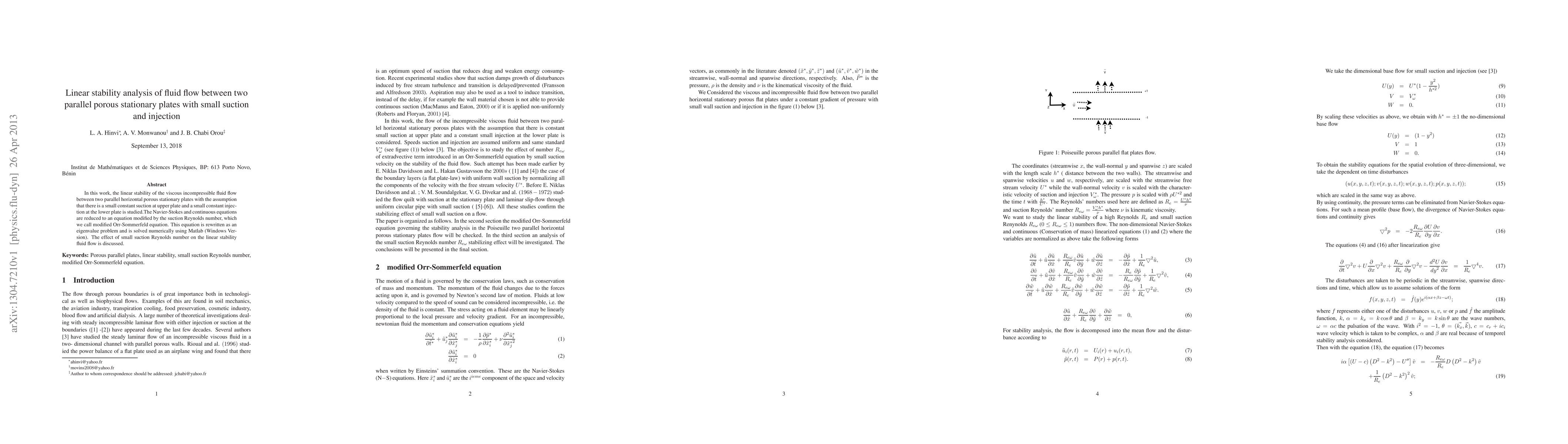 This paper investigates the linear stability of viscous incompressible fluid flow between two parallel porous stationary plates, considering small suction at the upper plate and injection at the lower plate. The study employs the modified Orr-Sommerfeld equation, solved numerically to analyze the impact of suction on fluid stability.