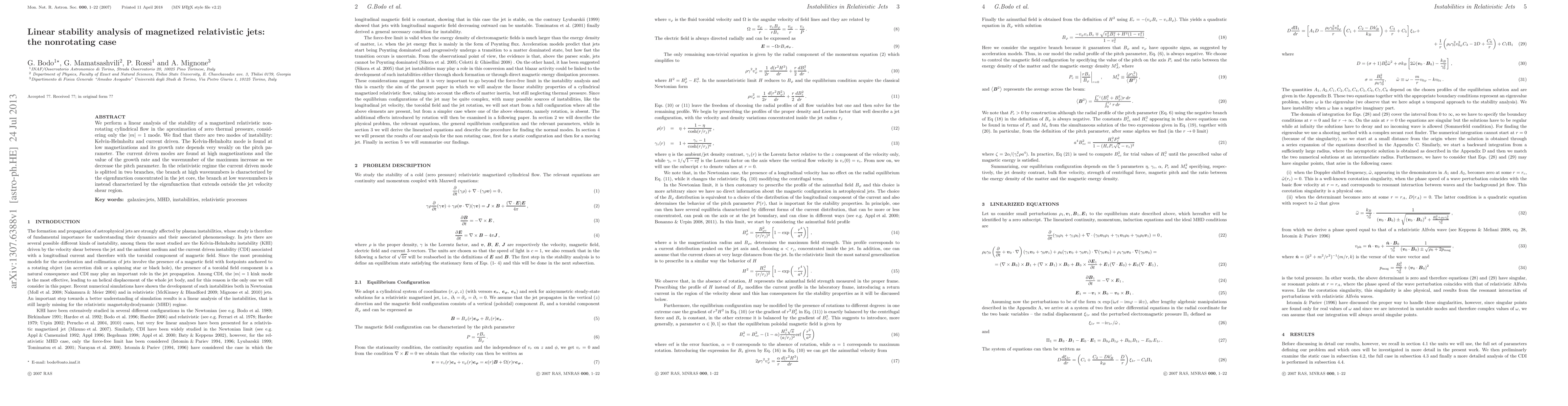 This paper conducts a linear stability analysis of magnetized relativistic non-rotating jets, focusing on the m=1 mode. It identifies two instability modes: Kelvin-Helmholtz at low magnetizations and current-driven at high magnetizations, with the latter branching into core and shear region modes in the relativistic regime.