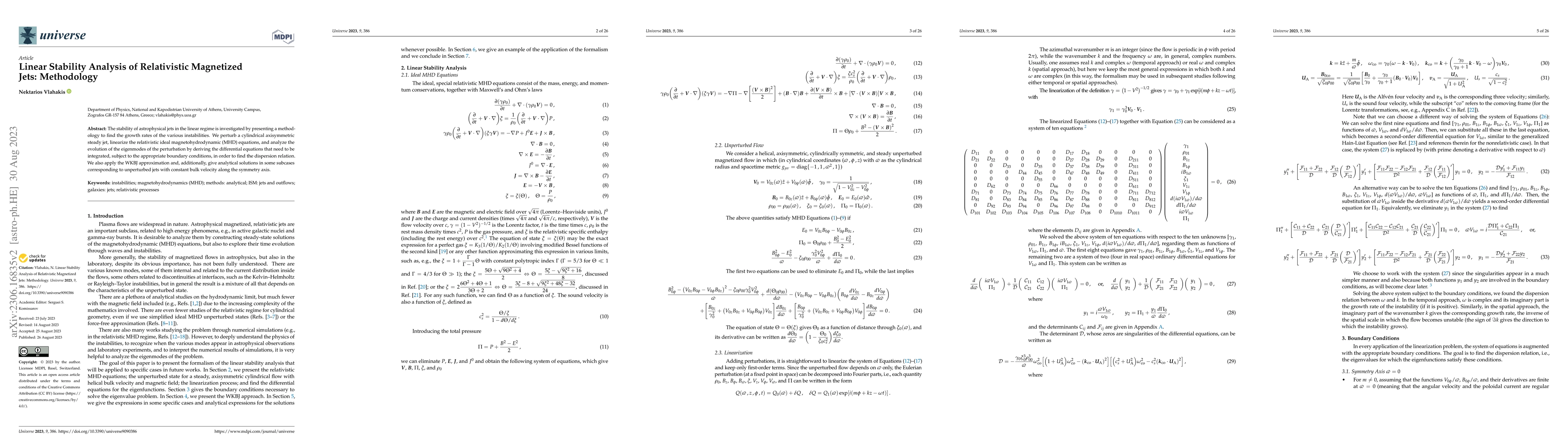 This paper outlines a methodology for linear stability analysis of relativistic magnetized jets, focusing on deriving the growth rates of instabilities through perturbation, linearization of relativistic ideal MHD equations, and application of the WKBJ approximation, with analytical solutions for specific subcases.