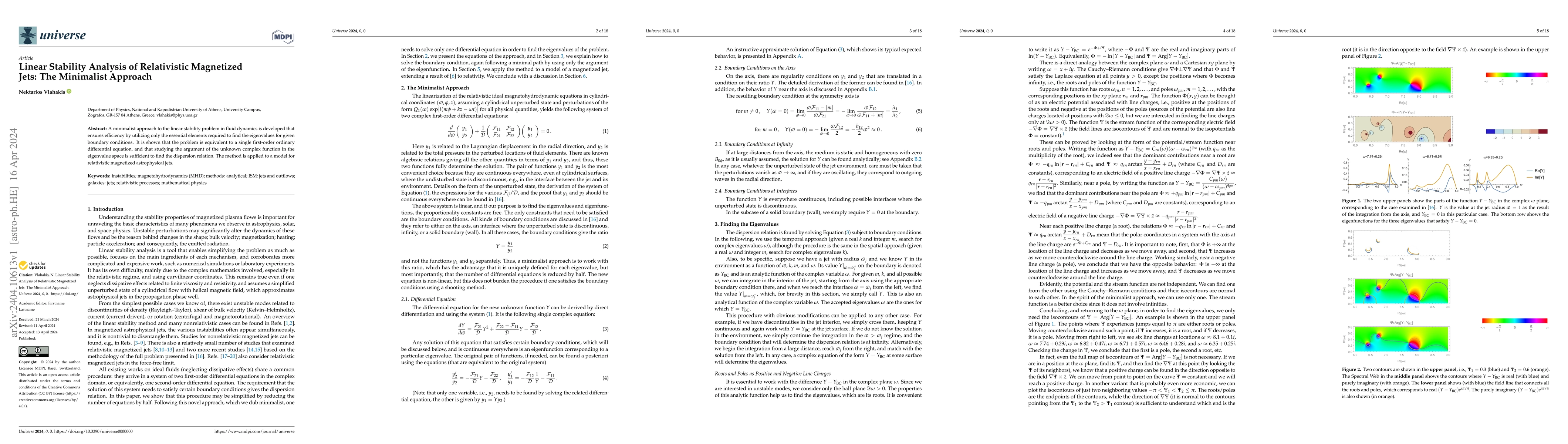 This paper proposes a minimalist linear stability analysis method that simplifies the study of relativistic magnetized jets by reducing the problem to a single first-order ordinary differential equation, focusing only on essential elements to determine eigenvalues and the dispersion relation. The approach is effectively applied to a theoretical model of astrophysical jets.