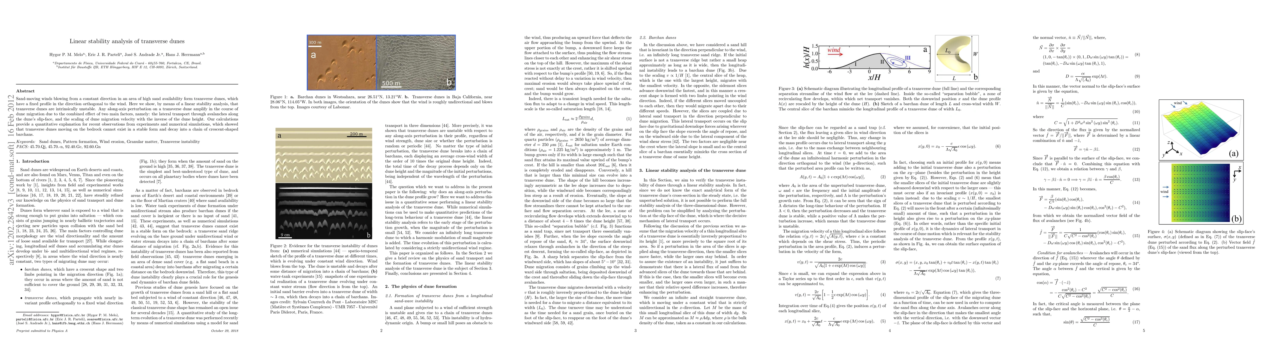 This paper conducts a linear stability analysis to demonstrate that transverse dunes are inherently unstable, with perturbations amplifying due to lateral transport via avalanches and the scaling of dune migration velocity. The findings support observations that transverse dunes decay into barchans.