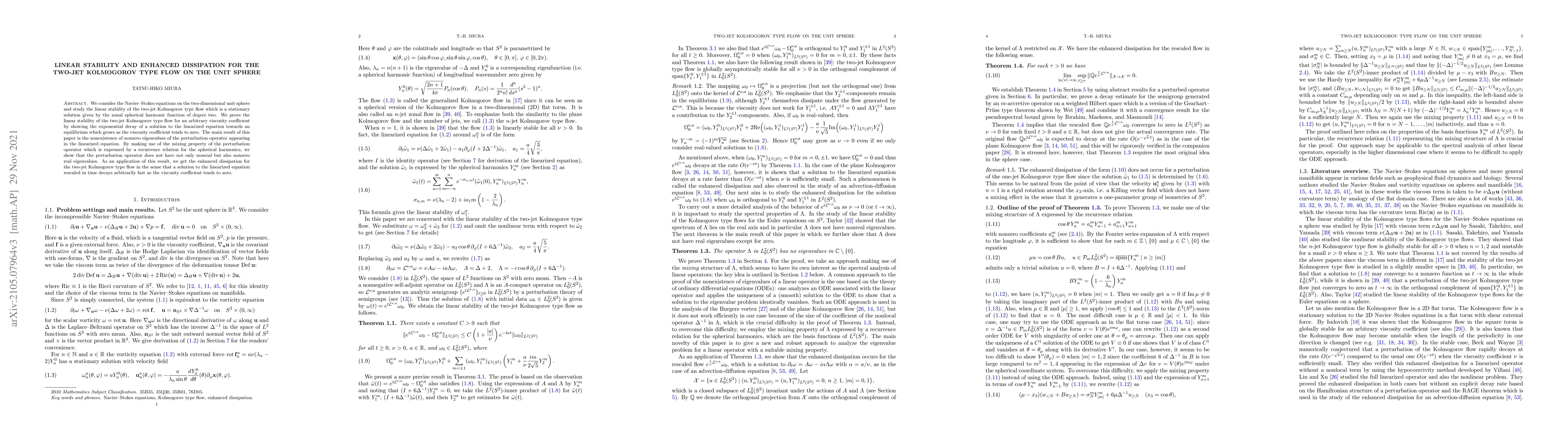 This paper proves the linear stability of the two-jet Kolmogorov type flow on the unit sphere by demonstrating the exponential decay of perturbations, showing no nonzero eigenvalues for the perturbation operator, and establishing enhanced dissipation as viscosity tends to zero.