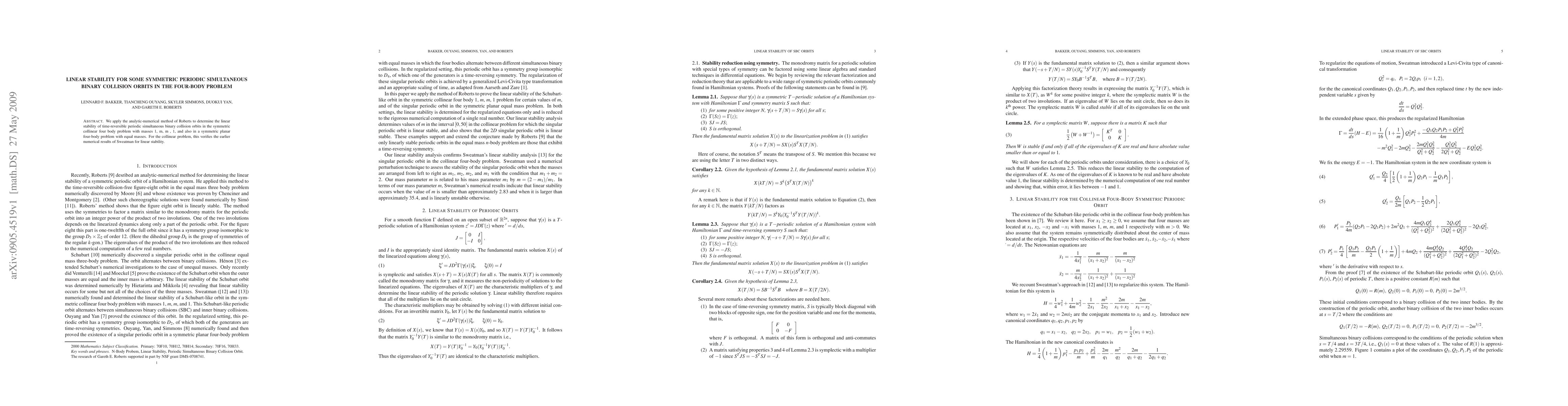 We apply the analytic-numerical method of Roberts to determine the linear stability of time-reversible periodic simultaneous binary collision orbits in the symmetric collinear four body problem with masses 1, m, m, 1, and also in a symmetric planar four-body problem with equal masses. For the collinear problem, this verifies the earlier numerical results of Sweatman for linear stability.