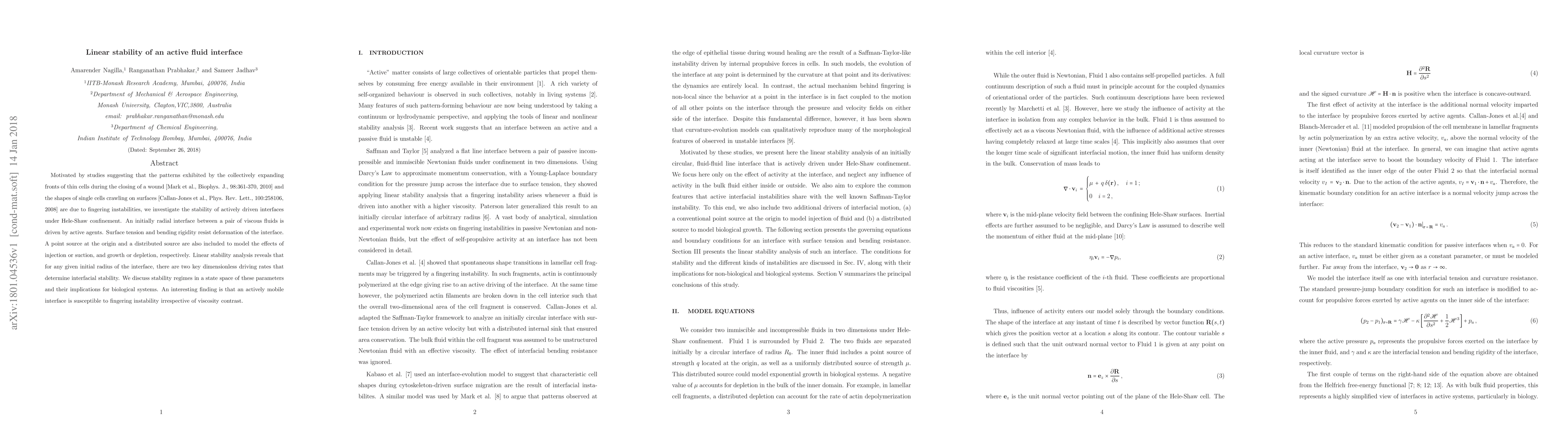 This paper investigates the linear stability of actively driven fluid interfaces under Hele-Shaw confinement, revealing two key dimensionless driving rates that determine stability. It finds that fingering instability can occur regardless of viscosity contrast, with implications for biological systems like wound healing and cell crawling.