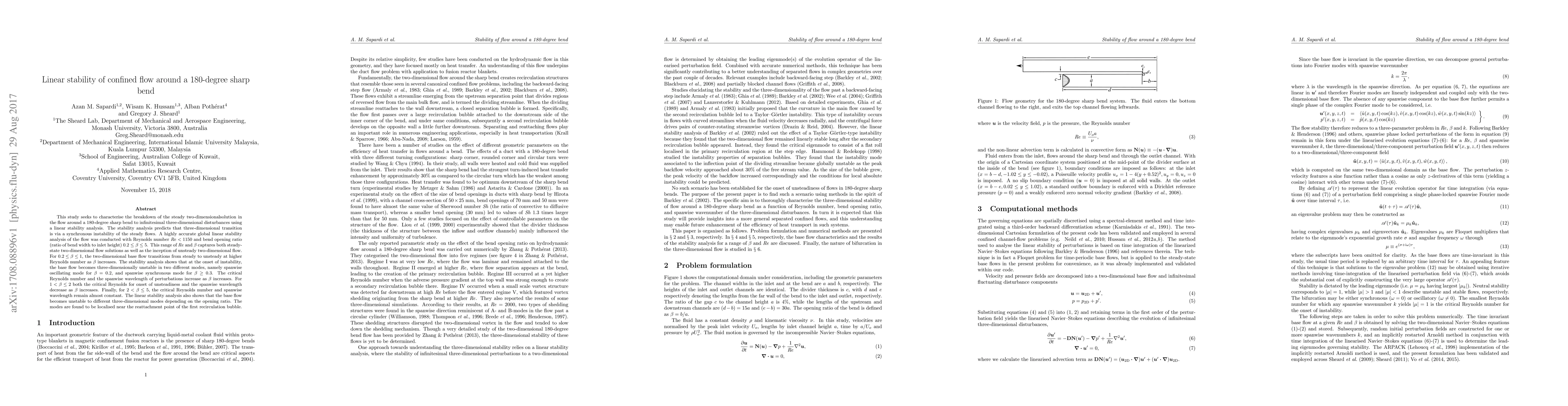 Researchers analyzed the stability of fluid flow around a 180-degree sharp bend using linear stability analysis, finding that 3D transitions occur via synchronous instability in steady flows and through localized modes near reattachment points as the bend opening ratio increases.
