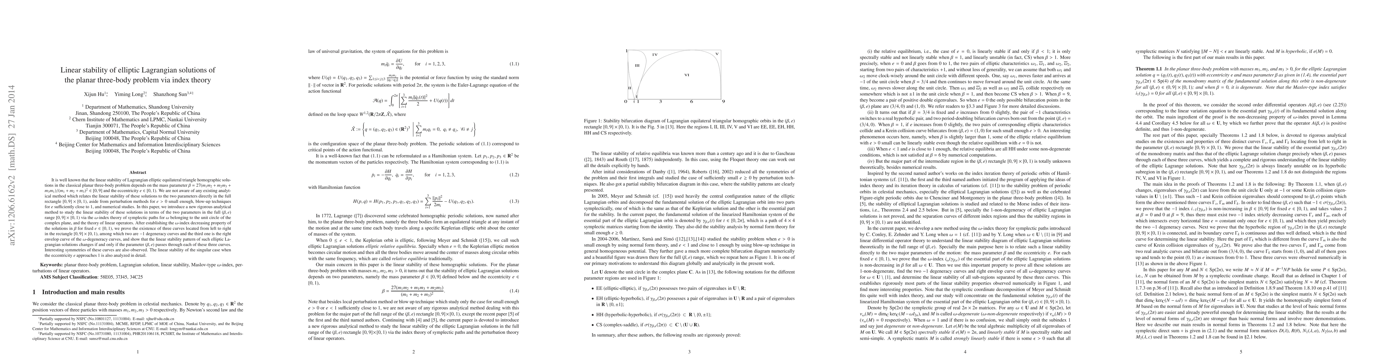 It is well known that the linear stability of Lagrangian elliptic equilateral triangle homographic solutions in the classical planar three-body problem depends on the mass parameter $\bb=27(m_1m_2+m_2m_3+m_3m_1)/(m_1+m_2+m_3)^2\in [0,9]$ and the eccentricity $e\in [0,1)$. We are not aware of any existing analytical method which relates the linear stability of these solutions to the two parameters directly in the full rectangle $[0,9]\times [0,1)$, besides perturbation methods for $e>0$ small enough, blow-up techniques for $e$ sufficiently close to 1, and numerical studies. In this paper, we introduce a new rigorous analytical method to study the linear stability of these solutions in terms of the two parameters in the full $(\bb,e)$ range $[0,9]\times [0,1)$ via the $\om$-index theory of symplectic paths for $\om$ belonging to the unit circle of the complex plane, and the theory of linear operators. After establishing the $\om$-index decreasing property of the solutions in $\bb$ for fixed $e\in [0,1)$, we prove the existence of three curves located from left to right in the rectangle $[0,9]\times [0,1)$, among which two are -1 degeneracy curves and the third one is the right envelop curve of the $\om$-degeneracy curves for $\om\not=1$, and show that the linear stability pattern of such elliptic Lagrangian solutions changes if and only if the parameter $(\bb,e)$ passes through each of these three curves. Interesting symmetries of these curves are also observed. The singular case when the eccentricity $e$ approaches to 1 is also analyzed in details concerning the linear stability.