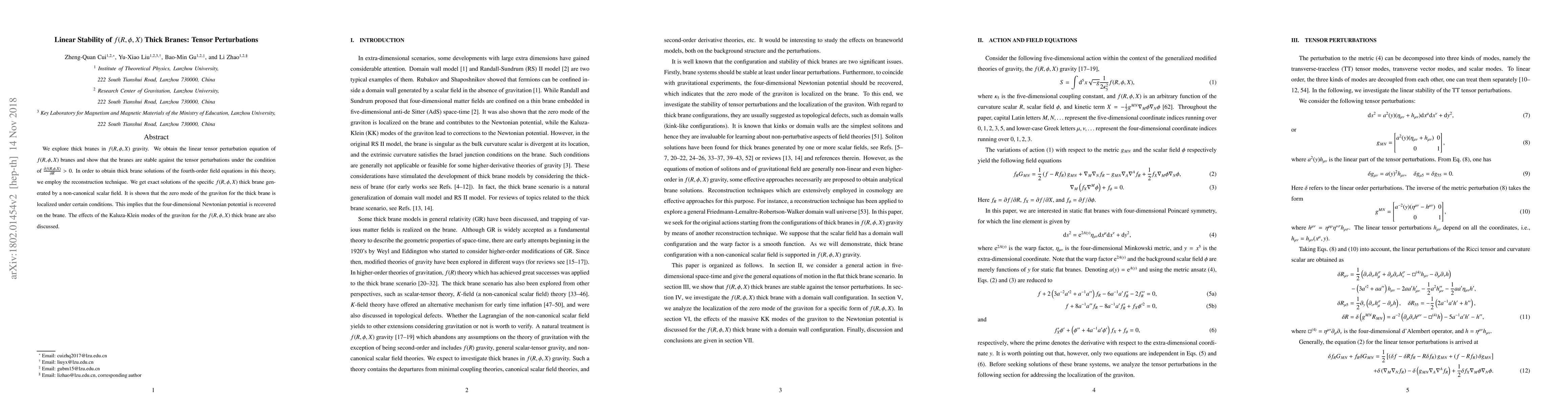 This paper investigates the linear stability of $f(R,\phi,X)$ thick branes against tensor perturbations, demonstrating stability under $\frac{\partial f(R,\phi,X)}{\partial R}>0$. Exact solutions for specific thick branes are obtained using reconstruction techniques, showing graviton zero mode localization and the recovery of four-dimensional Newtonian potential.