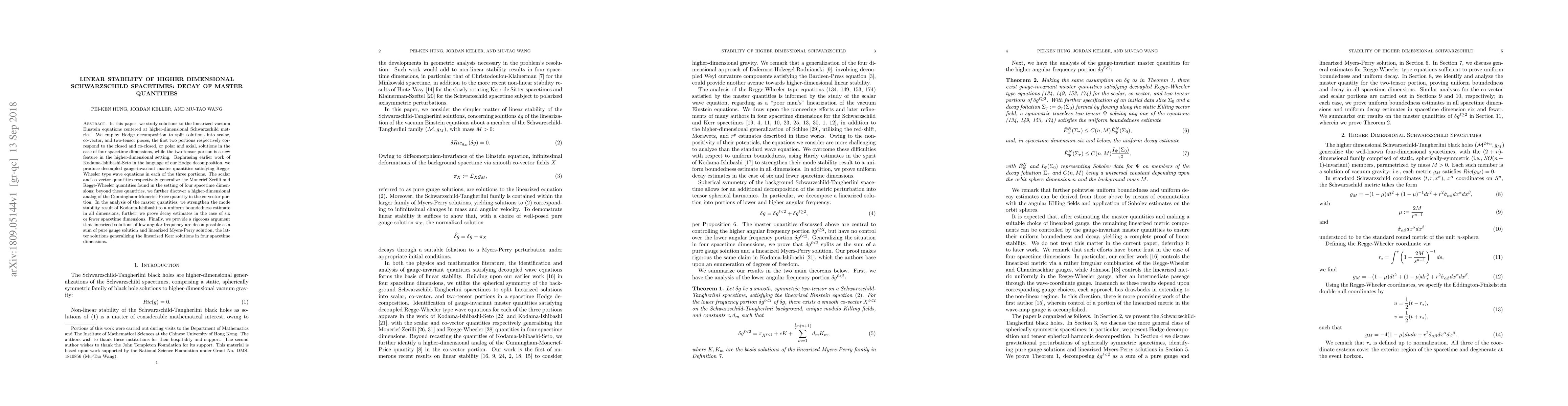 This paper studies linear stability of higher-dimensional Schwarzschild spacetimes by introducing new master quantities that generalize earlier findings, providing decay estimates for certain dimensions and a rigorous argument for decomposability of low-frequency solutions.