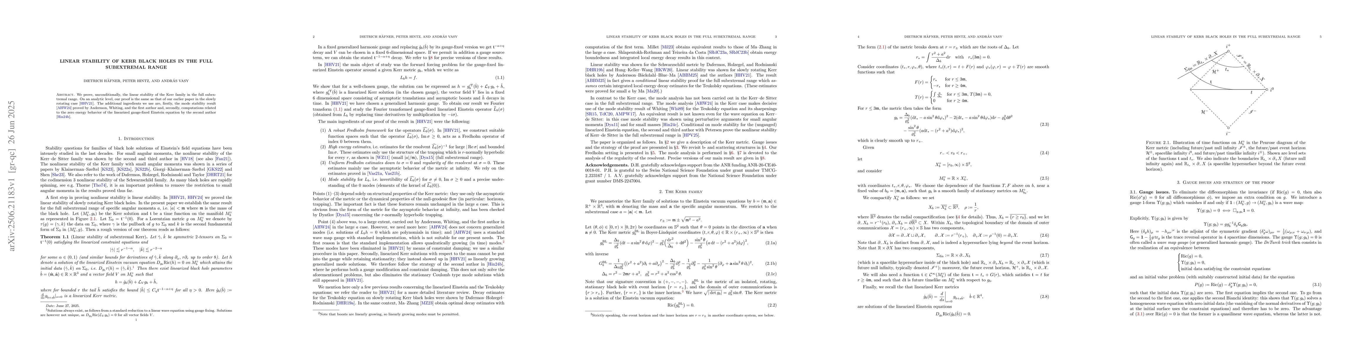 We prove, unconditionally, the linear stability of the Kerr family in the full subextremal range. On an analytic level, our proof is the same as that of our earlier paper in the slowly rotating case. The additional ingredients we use are, firstly, the mode stability result proved by Andersson, Whiting, and the first author and, secondly, computations related to the zero energy behavior of the linearized gauge-fixed Einstein equation in work by the second author.