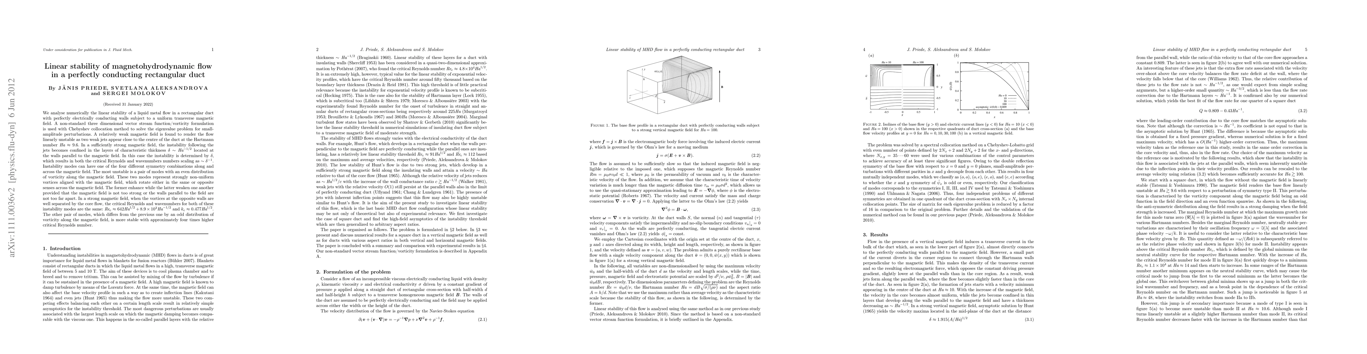 This paper numerically investigates the linear stability of liquid metal flow in a rectangular duct under a transverse magnetic field, revealing that weak magnetic fields induce instability with central jets, while strong fields confine instability to wall layers. The most unstable modes are non-uniform vortices aligned with the magnetic field, which interact differently depending on the field strength and duct geometry.