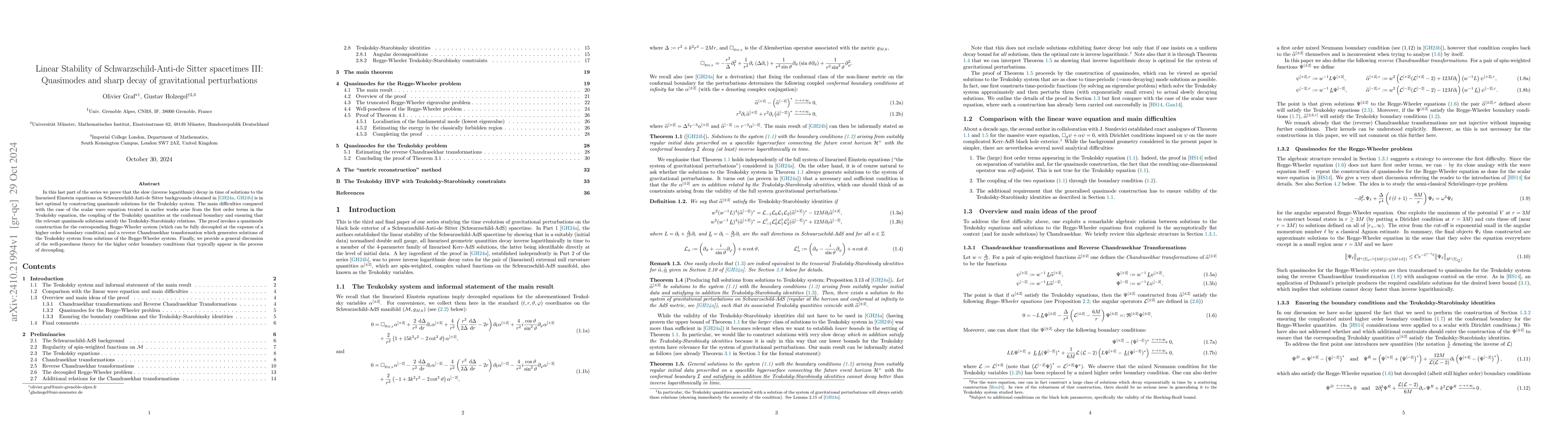 In this last part of the series we prove that the slow (inverse logarithmic) decay in time of solutions to the linearised Einstein equations on Schwarzschild-Anti-de Sitter backgrounds obtained in~\cite{Gra.Hol24,Gra.Hol24a} is in fact optimal by constructing quasimode solutions for the Teukolsky system. The main difficulties compared with the case of the scalar wave equation treated in earlier works arise from the first order terms in the Teukolsky equation, the coupling of the Teukolsky quantities at the conformal boundary and ensuring that the relevant quasimode solutions satisfy the Teukolsky-Starobinsky relations. The proof invokes a quasimode construction for the corresponding Regge-Wheeler system (which can be fully decoupled at the expense of a higher order boundary condition) and a reverse Chandrasekhar transformation which generates solutions of the Teukolsky system from solutions of the Regge-Wheeler system. Finally, we provide a general discussion of the well-posedness theory for the higher order boundary conditions that typically appear in the process of decoupling.