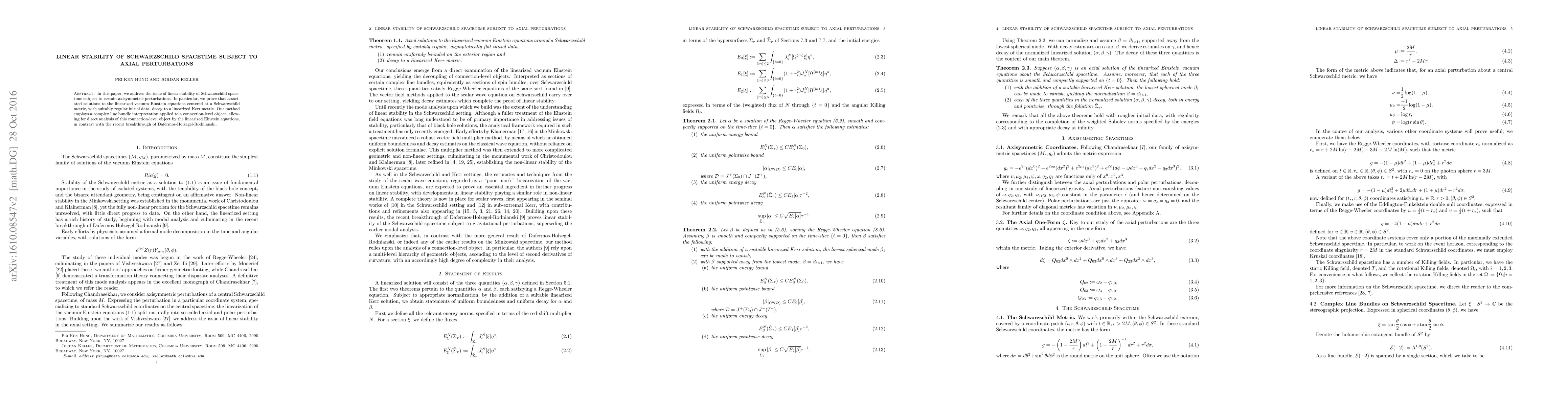 This paper investigates the linear stability of Schwarzschild spacetime under axisymmetric perturbations, proving that solutions to the linearized vacuum Einstein equations converge to a linearized Kerr metric, using a novel complex line bundle method for connection-level analysis.