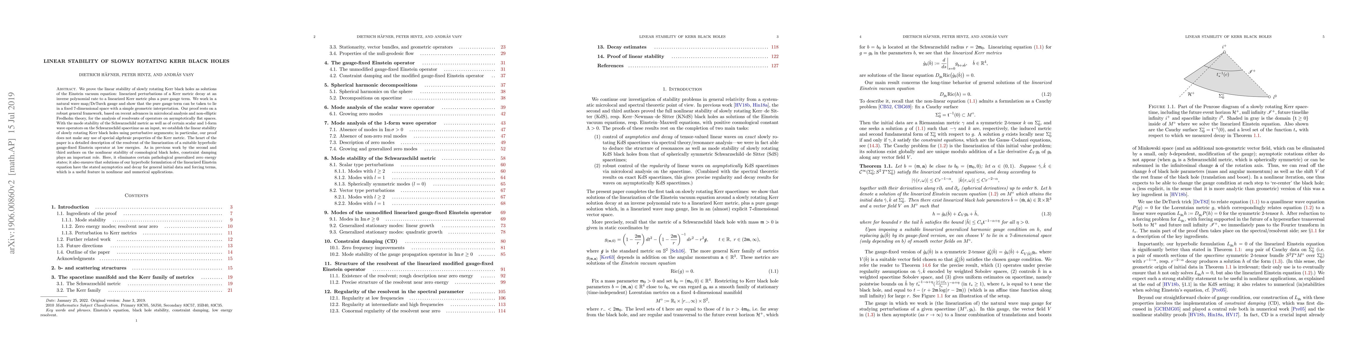 This paper proves the linear stability of slowly rotating Kerr black holes by showing that linearized perturbations decay at an inverse polynomial rate. The authors employ a robust framework based on microlocal analysis and non-elliptic Fredholm theory, leveraging constraint damping to ensure proper asymptotic behavior and decay of solutions.
