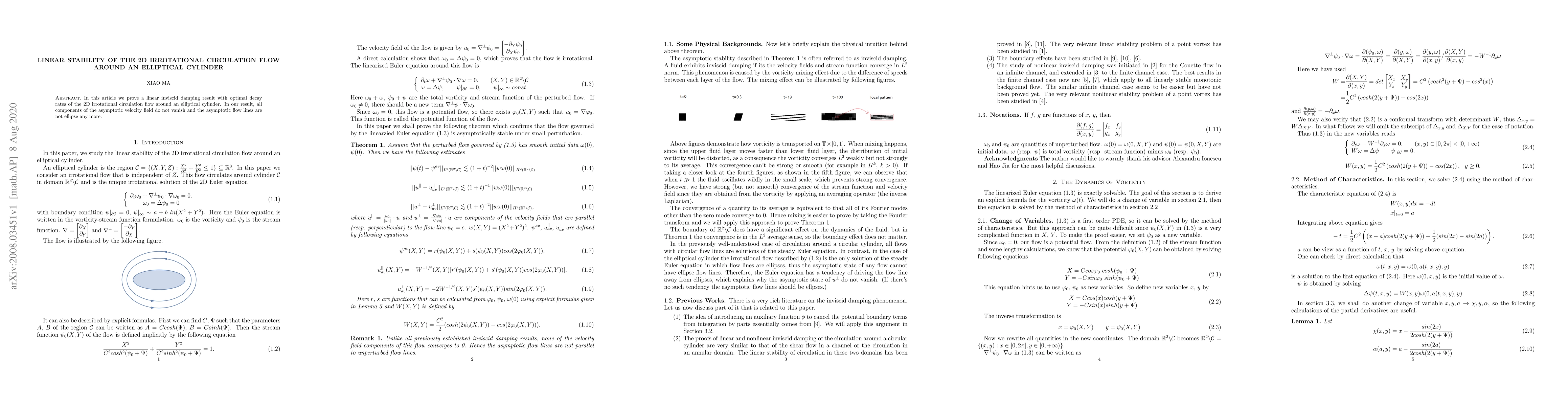 This paper proves optimal linear damping rates for the 2D irrotational circulation flow around an elliptical cylinder, demonstrating that the asymptotic velocity field does not vanish and the flow lines deviate from elliptical paths.