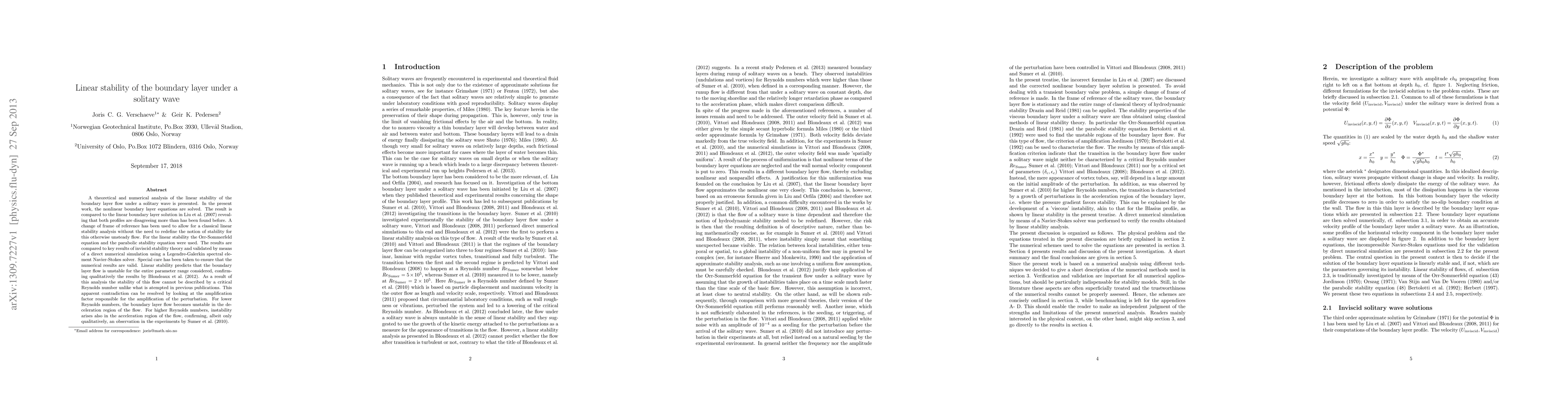 A theoretical and numerical analysis of the linear stability of the boundary layer flow under a solitary wave is presented. In the present work, the nonlinear boundary layer equations are solved. The result is compared to the linear boundary layer solution in Liu et al. (2007) reveal- ing that both profiles are disagreeing more than has been found before. A change of frame of reference has been used to allow for a classical linear stability analysis without the need to redefine the notion of stability for this otherwise unsteady flow. For the linear stability the Orr-Sommerfeld equation and the parabolic stability equation were used. The results are compared to key results of inviscid stability theory and validated by means of a direct numerical simulation using a Legendre-Galerkin spectral ele- ment Navier-Stokes solver. Special care has been taken to ensure that the numerical results are valid. Linear stability predicts that the boundary layer flow is unstable for the entire parameter range considered, confirm- ing qualitatively the results by Blondeaux et al. (2012). As a result of this analysis the stability of this flow cannot be described by a critical Reynolds number unlike what is atempted in previous publications. This apparent contradiction can be resolved by looking at the amplification factor responsible for the amplification of the perturbation. For lower Reynolds numbers, the boundary layer flow becomes unstable in the de- celeration region of the flow. For higher Reynolds numbers, instability arises also in the acceleration region of the flow, confirming, albeit only qualitatively, an observation in the experiments by Sumer et al. (2010).