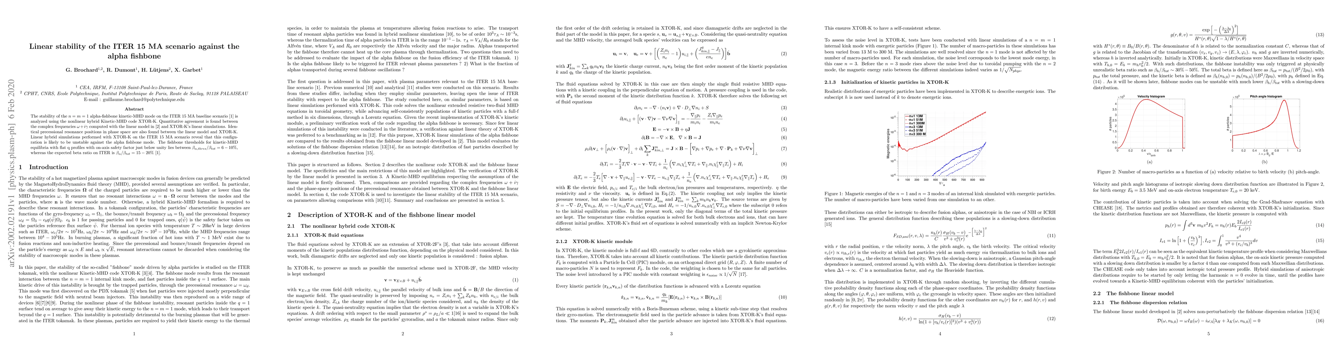 This paper analyzes the stability of the ITER 15 MA scenario against the alpha fishbone mode using the XTOR-K code, finding it likely unstable. The study confirms the mode's complex frequencies and resonance positions match those predicted by a linear model, indicating the fishbone thresholds are significantly lower than expected in ITER.