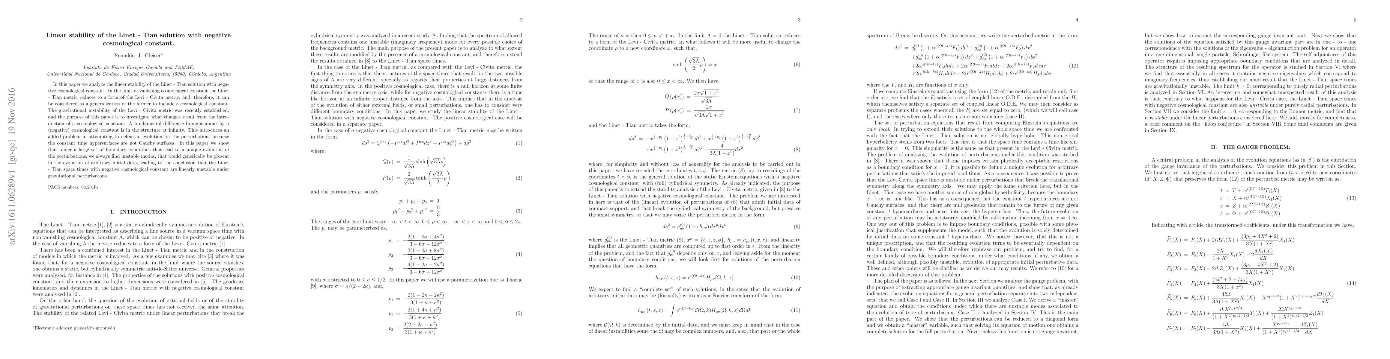 In this paper we analyze the linear stability of the Linet - Tian solution with negative cosmological constant. In the limit of vanishing cosmological constant the Linet - Tian metric reduces to a form of the Levi - Civita metric, and, therefore, it can be considered as a generalization of the former to include a cosmological constant. The gravitational instability of the Levi - Civita metric was recently established, and the purpose of this paper is to investigate what changes result from the introduction of a cosmological constant. A fundamental difference brought about by a (negative) cosmological constant is in the structure at infinity. This introduces an added problem in attempting to define an evolution for the perturbations because the constant time hypersurfaces are not Cauchy surfaces. In this paper we show that under a large set of boundary conditions that lead to a unique evolution of the perturbations, we always find unstable modes, that would generically be present in the evolution of arbitrary initial data, leading to the conclusion that the Linet - Tian space times with negative cosmological constant are linearly unstable under gravitational perturbations.