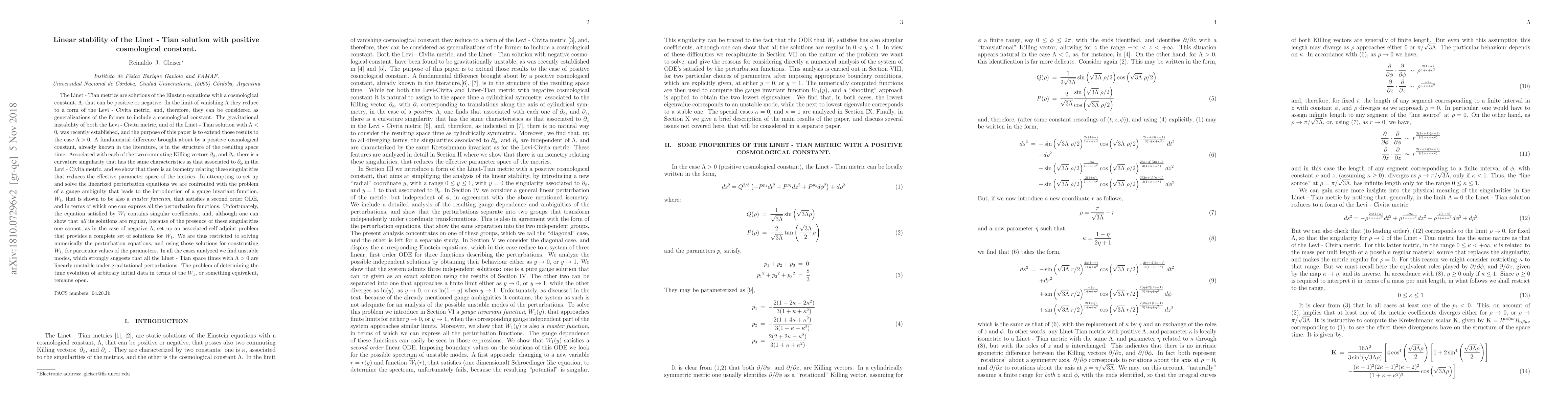 The purpose of this paper is to extend the analysis of gravitational instability of the Linet - Tian solution to the case $\Lambda > 0$. A fundamental difference brought about by $\Lambda >0$, as compared to $\Lambda<0$ is in the structure of the resulting space time. Associated with each of the two commuting Killing vectors $\partial_{\phi}$, and $\partial_{z}$, there is a curvature singularity that has the same characteristics as that associated to $\partial_{\phi}$ in the Levi - Civita metric, and we show that there is an isometry relating these singularities that reduces the effective parameter space of the metrics. In attempting to set up and solve the linearized perturbation equations we are confronted with the problem of a gauge ambiguity that leads to the introduction of a gauge invariant function, $W_1$, that is shown to be also a {\em master function}, that satisfies a second order ODE, and in terms of which one can express all the perturbation functions. Unfortunately, the equation satisfied by $W_1$ contains singular coefficients, and, although {\em all} its solutions are regular, because of the presence of these singularities one cannot, as in the case of negative $\Lambda$, set up an associated self adjoint problem that provides a complete set of solutions for $W_1$. We are thus restricted to solving numerically the perturbation equations, and using those solutions for constructing $W_1$, for particular values of the parameters. In all the cases analyzed we find unstable modes, which strongly suggests that all the Linet - Tian space times with $\Lambda > 0$ are linearly unstable under gravitational perturbations. The problem of determining the time evolution of arbitrary initial data in terms of the $W_1$, or something equivalent, remains open.