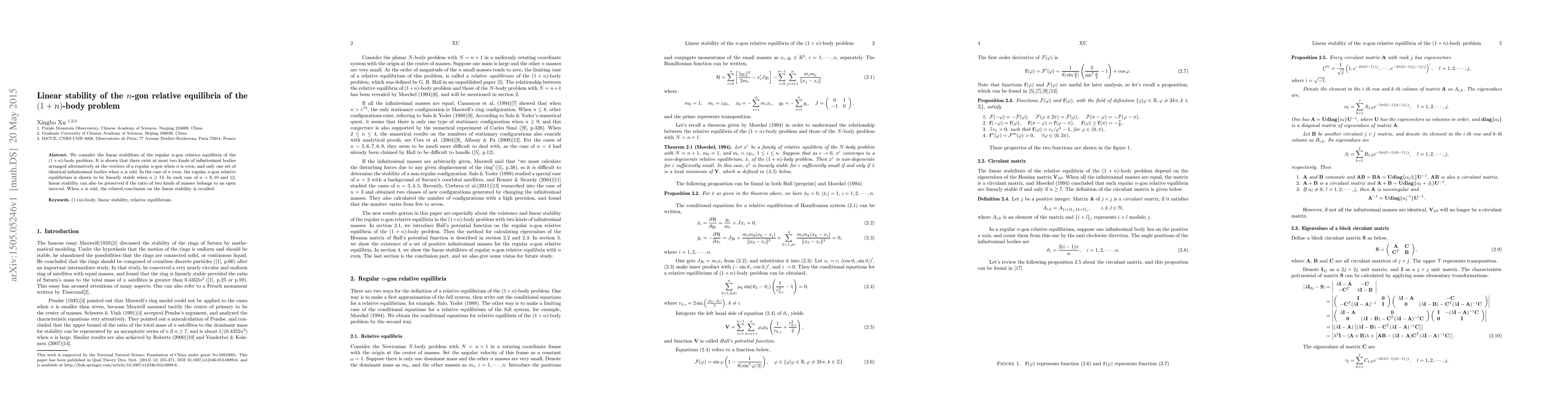 This paper investigates the linear stability of regular n-gon relative equilibria in the (1+n)-body problem, revealing that for even n, at most two types of infinitesimal bodies can be arranged alternately, while for odd n, only one type exists. It concludes that for even n ≥ 14, the n-gon equilibrium is linearly stable, and for n=8,10,12, stability can be maintained under specific mass ratios.
