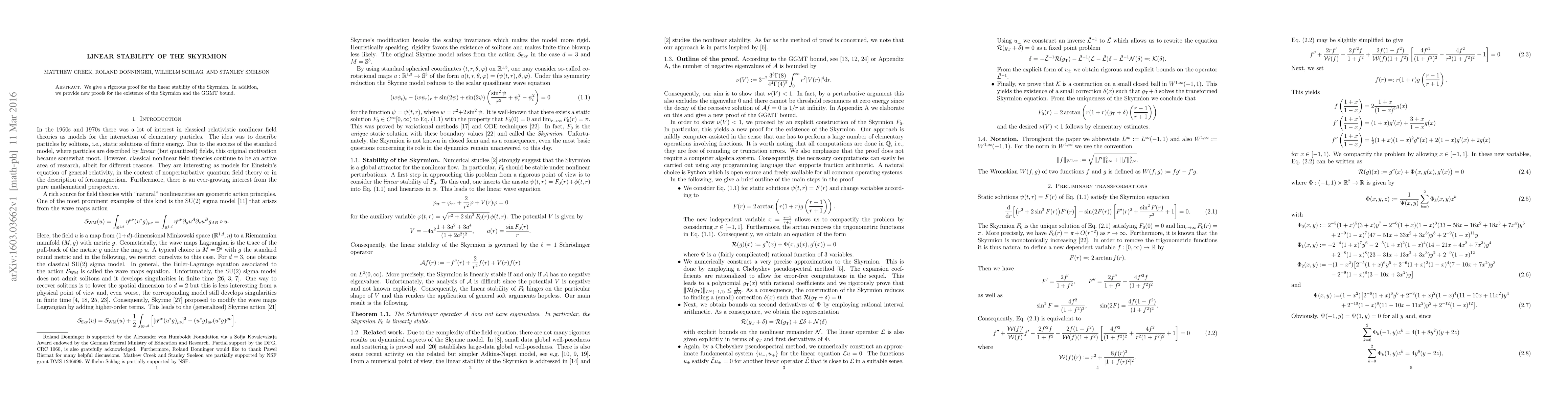 This paper proves the linear stability of the Skyrmion, a topological phase in materials science, and provides new proofs for its existence and a bound on its GGMT value.