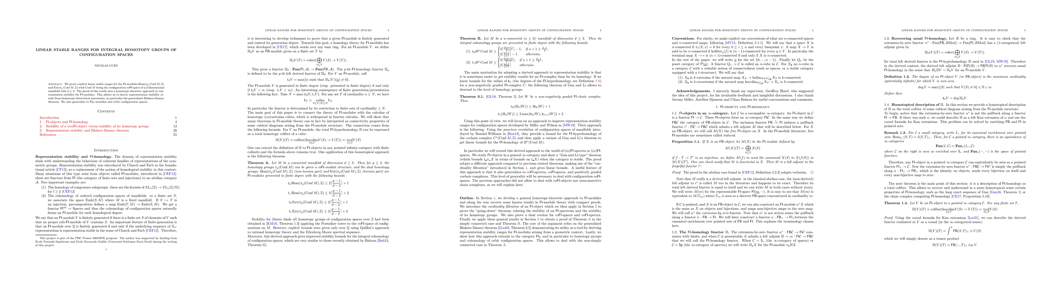 Researchers prove explicit linear stable ranges for homotopy groups of configuration spaces of manifolds, using a homotopy-theoretic approach to representation stability.