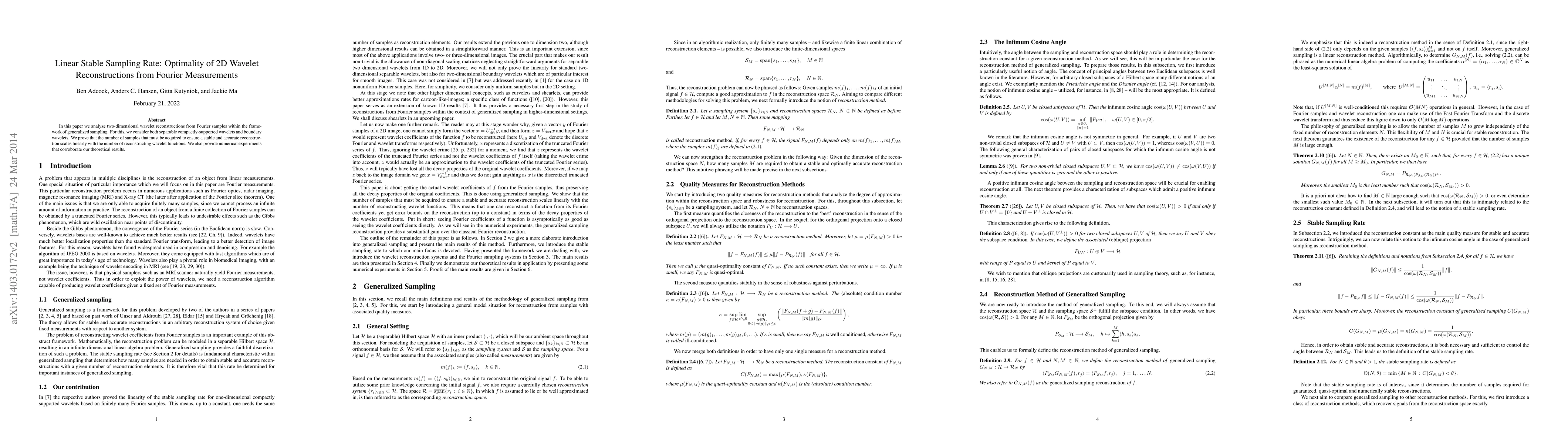This paper investigates optimal 2D wavelet reconstructions from Fourier measurements, proving that the required sample rate scales linearly with the number of wavelet functions. Numerical experiments support the theoretical findings.