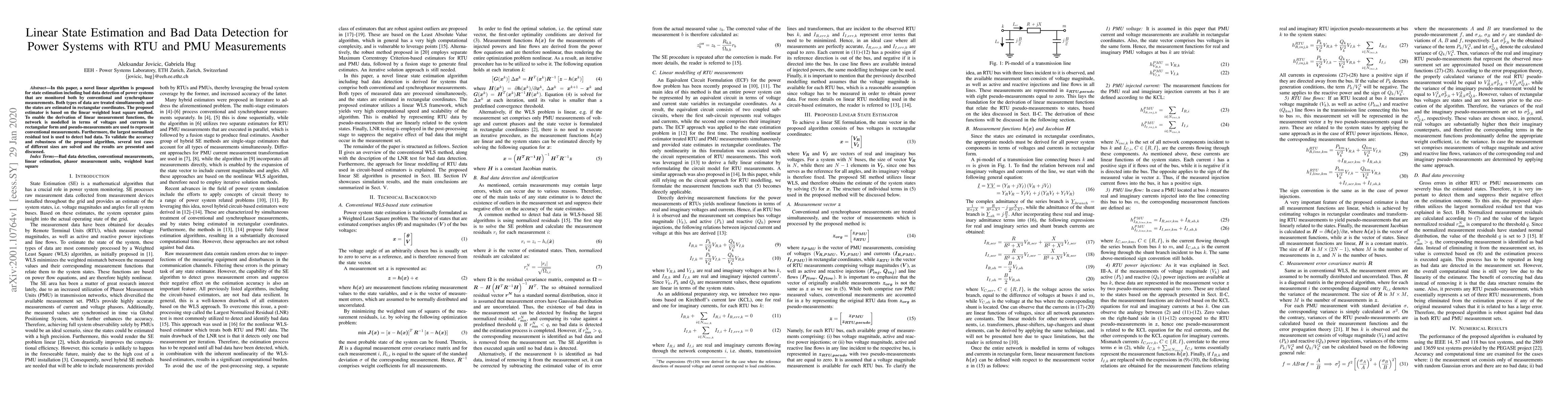 This paper proposes a novel linear algorithm for state estimation and bad data detection in power systems using both RTU and PMU measurements. The algorithm employs linear weighted least squares and uses rectangular coordinates for state estimation, with pseudo-measurements for conventional data. The largest normalized residual test is applied for bad data detection, validated through various test cases.