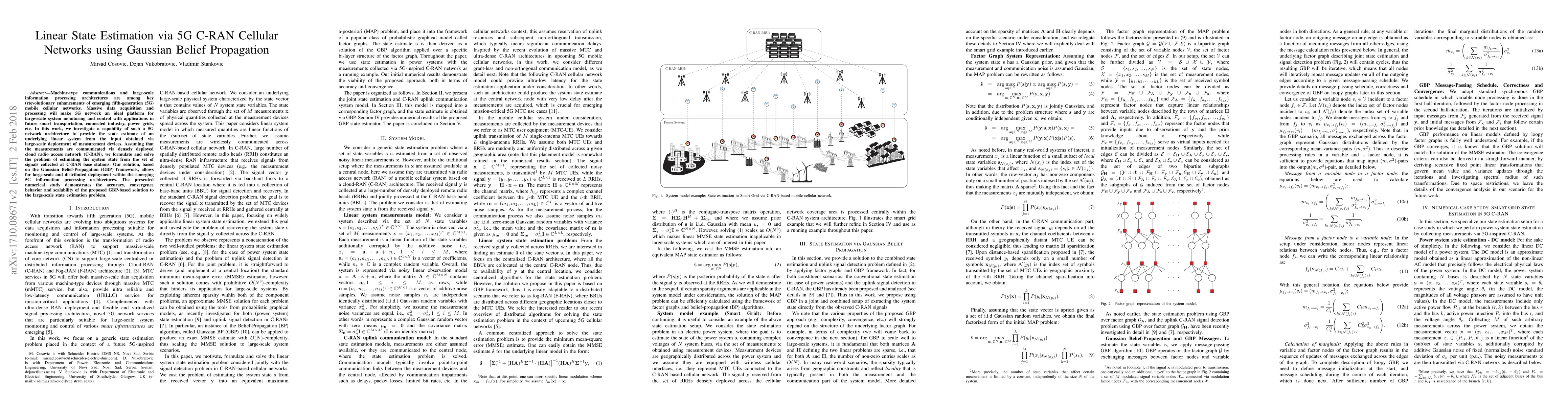 This paper explores the use of 5G C-RAN cellular networks for linear state estimation via Gaussian Belief Propagation, demonstrating its accuracy, convergence, and scalability in large-scale system monitoring applications. The proposed GBP-based solution enables distributed and large-scale deployment within emerging 5G architectures.