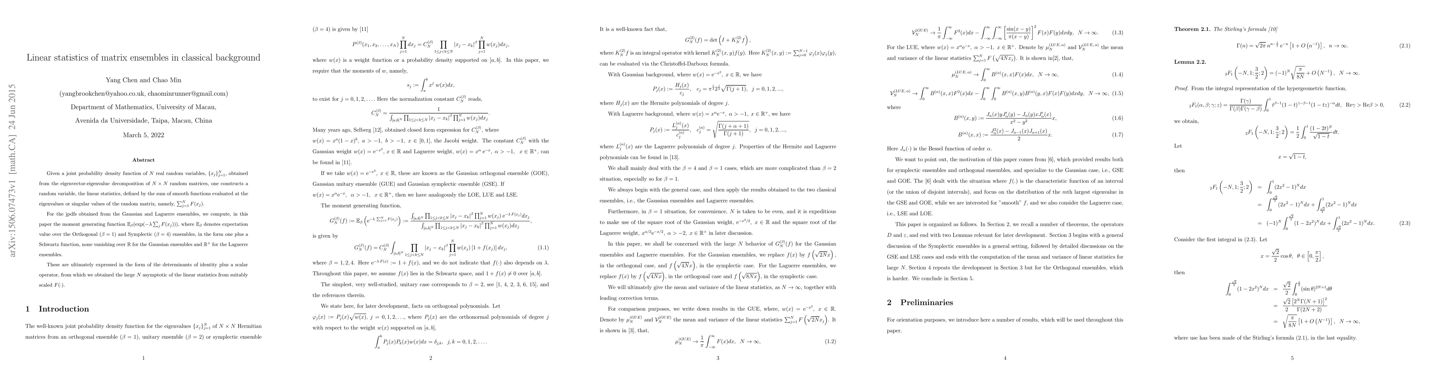 This paper studies linear statistics of matrix ensembles, computing their moment generating functions for Gaussian and Laguerre ensembles to find large N asymptotic behavior.