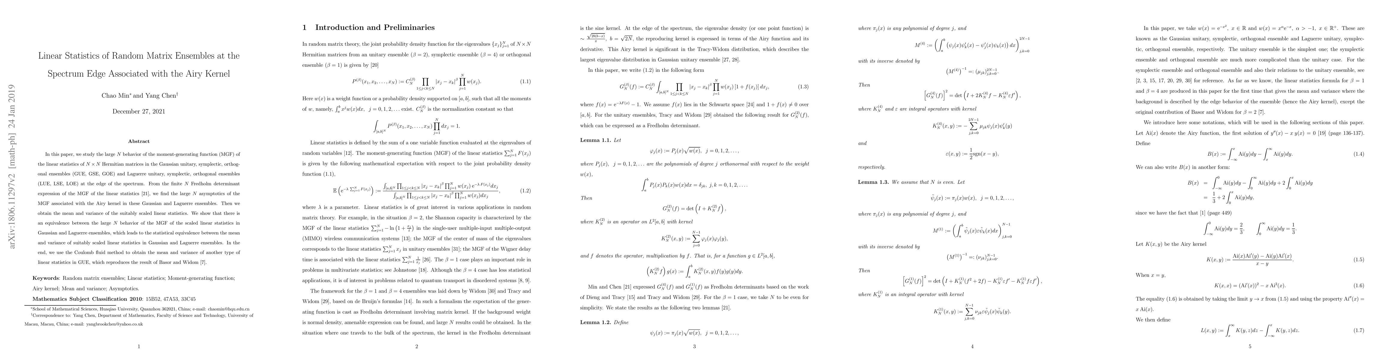 This paper investigates the large $N$ behavior of the moment-generating function of linear statistics for Hermitian matrices in various random matrix ensembles at the spectrum edge, revealing an equivalence between Gaussian and Laguerre ensembles through the Airy kernel, and confirming statistical equivalence in their mean and variance.