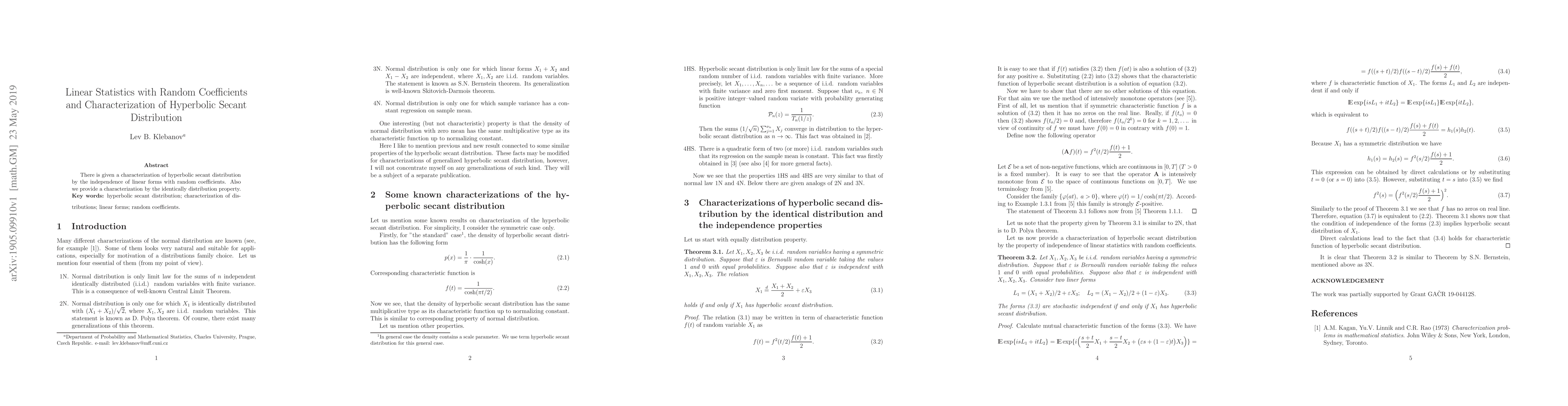 This paper characterizes the hyperbolic secant distribution through the independence of linear forms with random coefficients, establishing an identical distribution property. Keywords include hyperbolic secant distribution, distribution characterization, linear forms, and random coefficients.