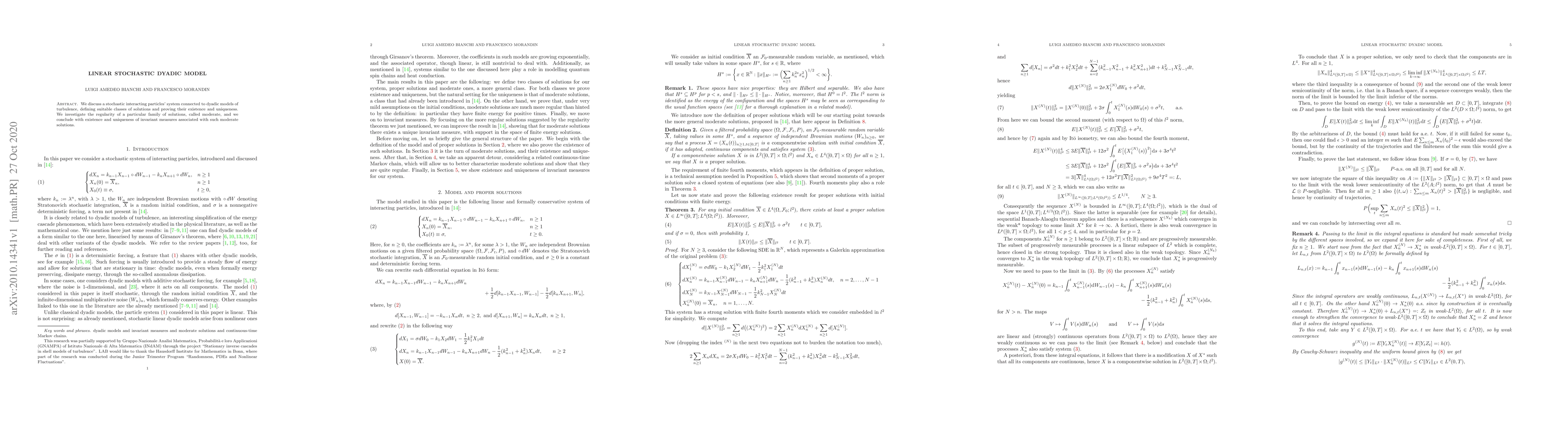 We discuss a stochastic interacting particles' system connected to dyadic models of turbulence, defining suitable classes of solutions and proving their existence and uniqueness. We investigate the regularity of a particular family of solutions, called moderate, and we conclude with existence and uniqueness of invariant measures associated with such moderate solutions.