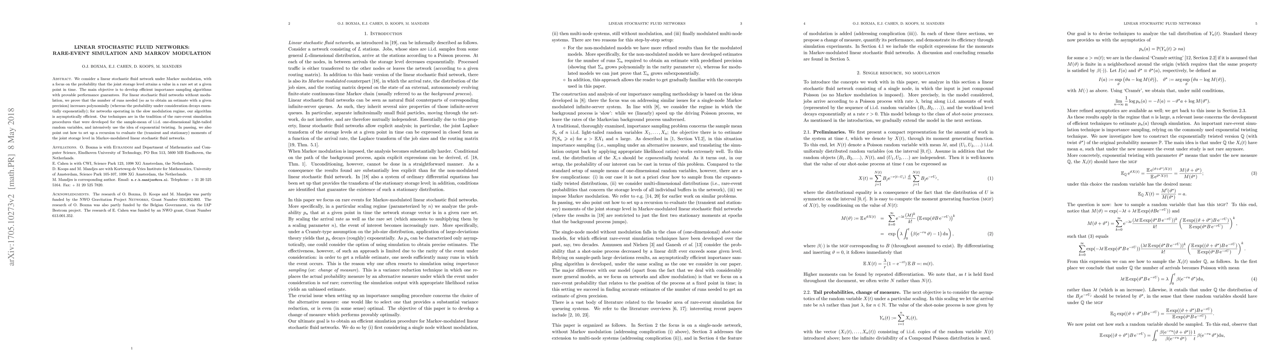 We consider a linear stochastic fluid network under Markov modulation, with a focus on the probability that the joint storage level attains a value in a rare set at a given point in time. The main objective is to develop efficient importance sampling algorithms with provable performance guarantees. For linear stochastic fluid networks without modulation, we prove that the number of runs needed (so as to obtain an estimate with a given precision) increases polynomially (whereas the probability under consideration decays essentially exponentially); for networks operating in the slow modulation regime, our algorithm is asymptotically efficient. Our techniques are in the tradition of the rare-event simulation procedures that were developed for the sample-mean of i.i.d. one-dimensional light-tailed random variables, and intensively use the idea of exponential twisting. In passing, we also point out how to set up a recursion to evaluate the (transient and stationary) moments of the joint storage level in Markov-modulated linear stochastic fluid networks.